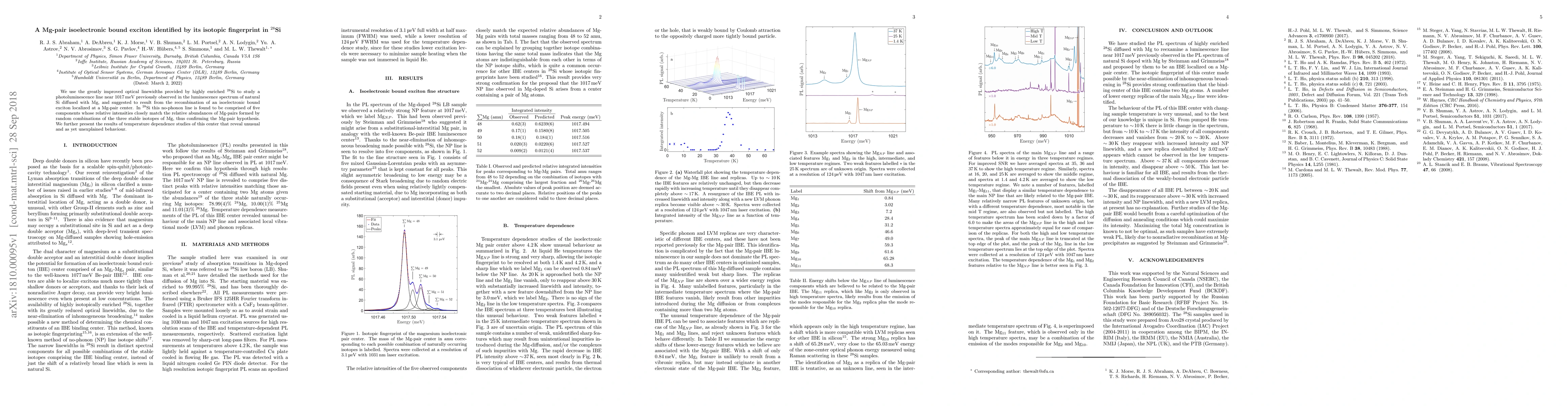 We use the greatly improved optical linewidths provided by highly enriched $^{28}$Si to study a photoluminescence line near 1017 meV previously observed in the luminescence spectrum of natural Si diffused with Mg, and suggested to result from the recombination of an isoelectronic bound exciton localized at a Mg-pair center. In $^{28}$Si this no-phonon line is found to be comprised of five components whose relative intensities closely match the relative abundances of Mg-pairs formed by random combinations of the three stable isotopes of Mg, thus confirming the Mg-pair hypothesis. We further present the results of temperature dependence studies of this center that reveal unusual and as yet unexplained behaviour.