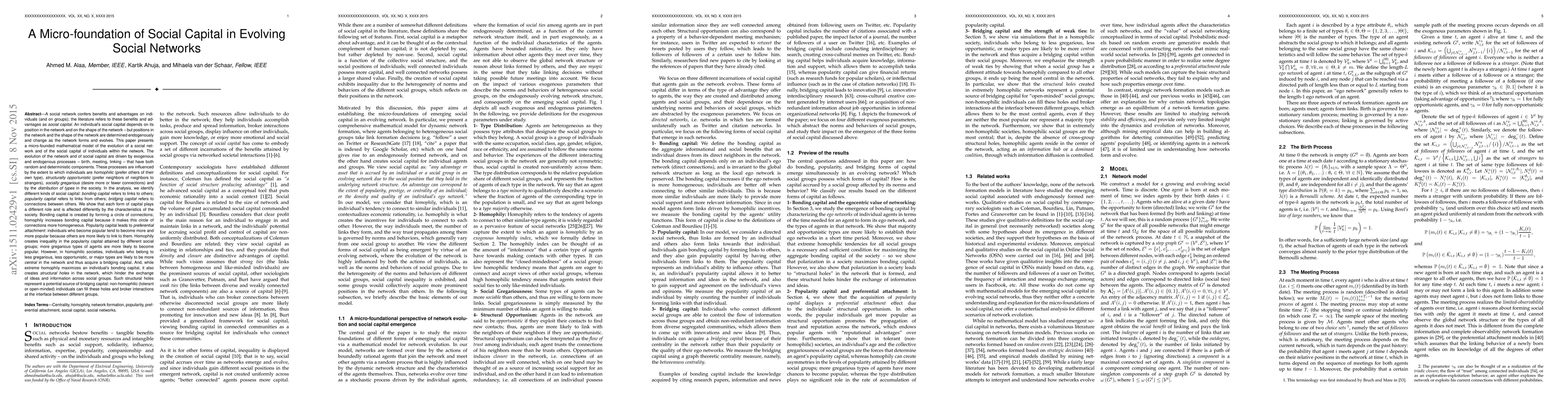 This paper develops a micro-founded mathematical model to explore the evolution of social networks and the types of social capital—bonding, popularity, and bridging—that arise from individual behaviors like homophily, opportunism, and gregariousness. It identifies how these behaviors influence network structure and capital distribution among different social groups.