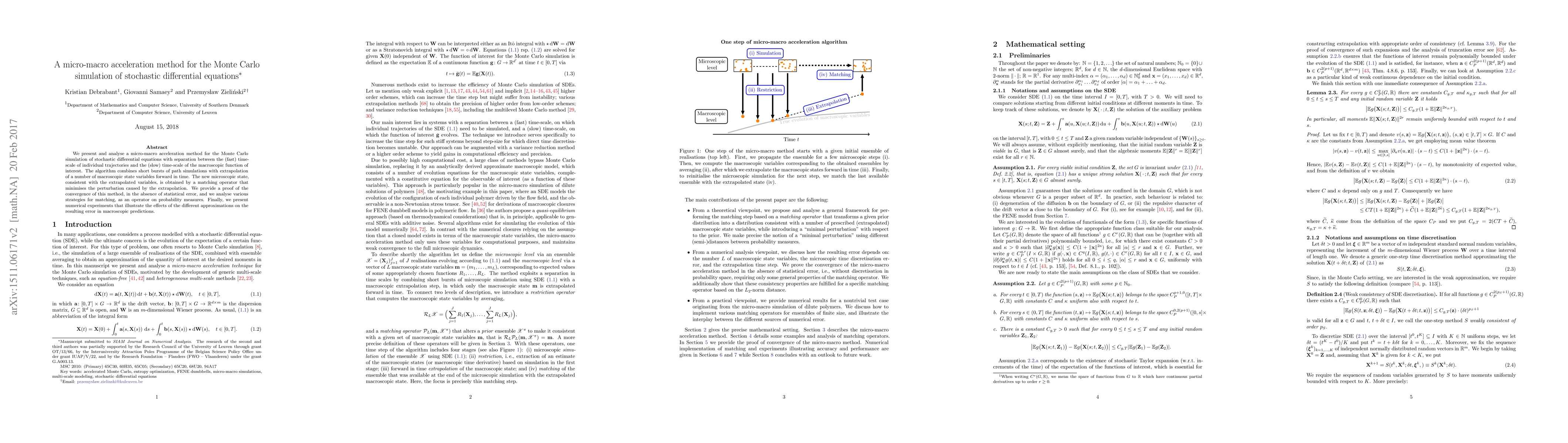 This paper introduces a micro-macro acceleration method for Monte Carlo simulations of stochastic differential equations, combining short path simulations with macroscopic state variable extrapolation to efficiently handle different time scales. The method is proven to converge and is tested numerically to assess its impact on macroscopic prediction accuracy.
