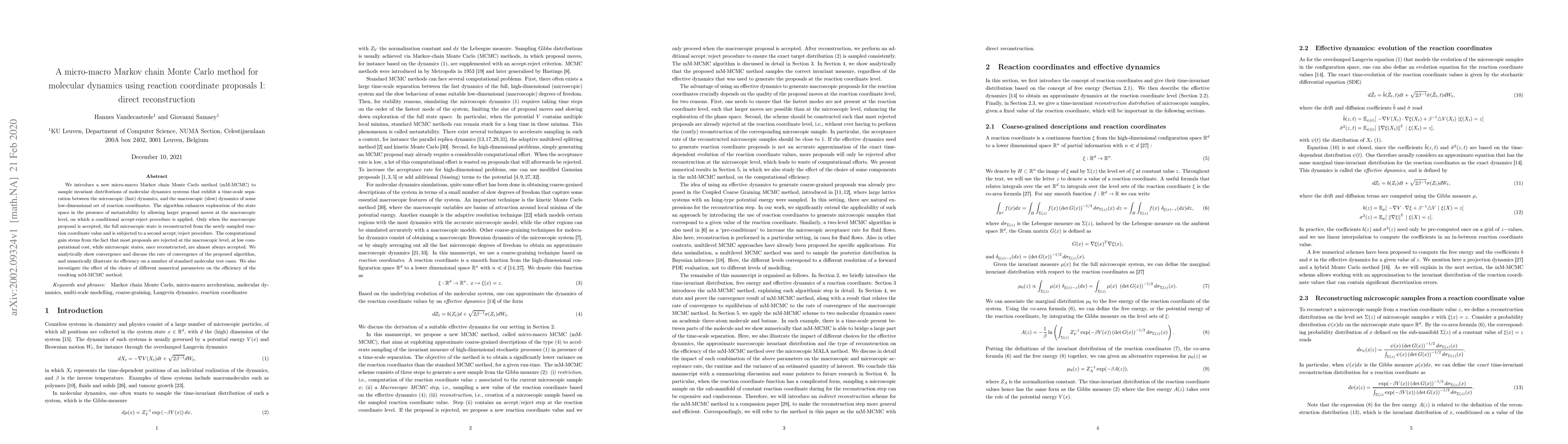 We introduce a new micro-macro Markov chain Monte Carlo method (mM-MCMC) to sample invariant distributions of molecular dynamics systems that exhibit a time-scale separation between the microscopic (fast) dynamics, and the macroscopic (slow) dynamics of some low-dimensional set of reaction coordinates. The algorithm enhances exploration of the state space in the presence of metastability by allowing larger proposal moves at the macroscopic level, on which a conditional accept-reject procedure is applied. Only when the macroscopic proposal is accepted, the full microscopic state is reconstructed from the newly sampled reaction coordinate value and is subjected to a second accept/reject procedure. The computational gain stems from the fact that most proposals are rejected at the macroscopic level, at low computational cost, while microscopic states, once reconstructed, are almost always accepted. We analytically show convergence and discuss the rate of convergence of the proposed algorithm, and numerically illustrate its efficiency on a number of standard molecular test cases. We also investigate the effect of the choice of different numerical parameters on the efficiency of the resulting mM-MCMC method.
