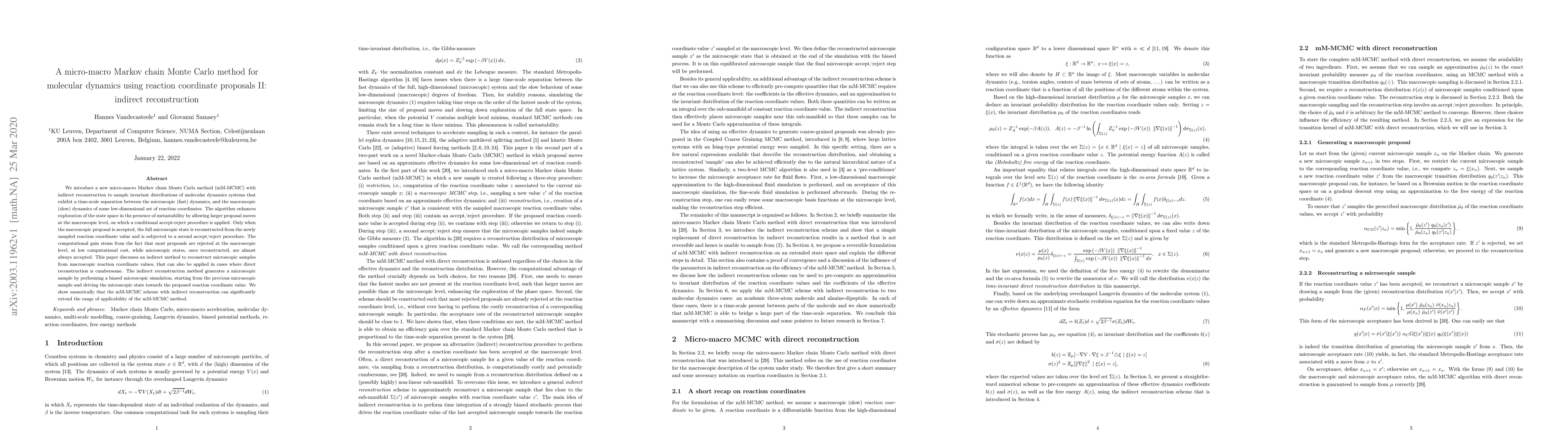 We introduce a new micro-macro Markov chain Monte Carlo method (mM-MCMC) with indirect reconstruction to sample invariant distributions of molecular dynamics systems that exhibit a time-scale separation between the microscopic (fast) dynamics, and the macroscopic (slow) dynamics of some low-dimensional set of reaction coordinates. The algorithm enhances exploration of the state space in the presence of metastability by allowing larger proposal moves at the macroscopic level, on which a conditional accept-reject procedure is applied. Only when the macroscopic proposal is accepted, the full microscopic state is reconstructed from the newly sampled reaction coordinate value and is subjected to a second accept/reject procedure. The computational gain stems from the fact that most proposals are rejected at the macroscopic level, at low computational cost, while microscopic states, once reconstructed, are almost always accepted. This paper discusses an indirect method to reconstruct microscopic samples from macroscopic reaction coordinate values, that can also be applied in cases where direct reconstruction is cumbersome. The indirect reconstruction method generates a microscopic sample by performing a biased microscopic simulation, starting from the previous microscopic sample and driving the microscopic state towards the proposed reaction coordinate value. We show numerically that the mM-MCMC scheme with indirect reconstruction can significantly extend the range of applicability of the mM-MCMC method.