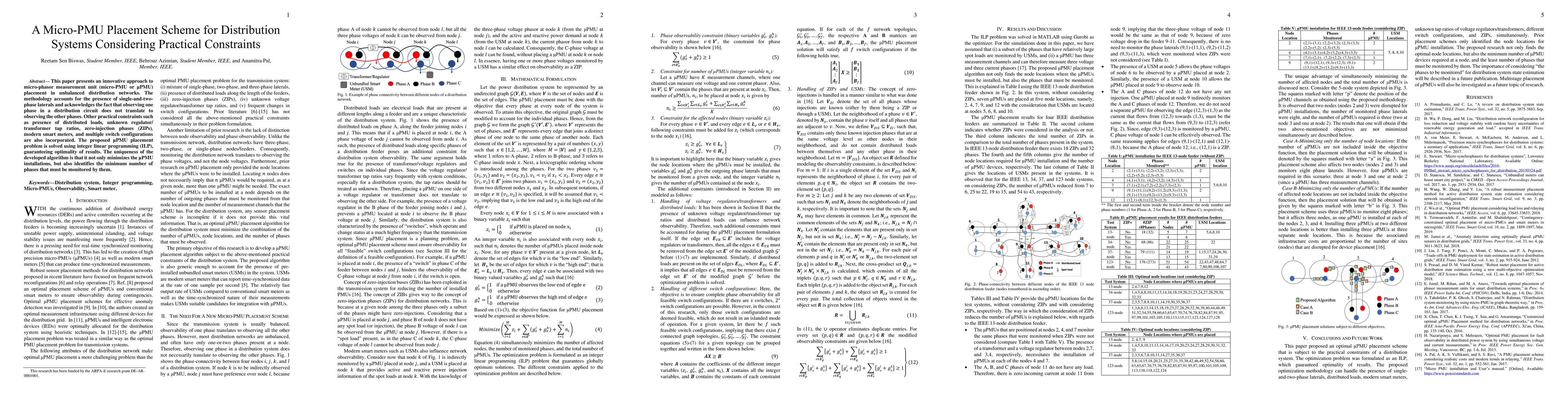 This paper proposes an optimal micro-PMU placement scheme for unbalanced distribution networks, considering practical constraints like single-and-two-phase laterals, distributed loads, and unknown tap ratios, using integer linear programming to minimize both installations and monitored phases.