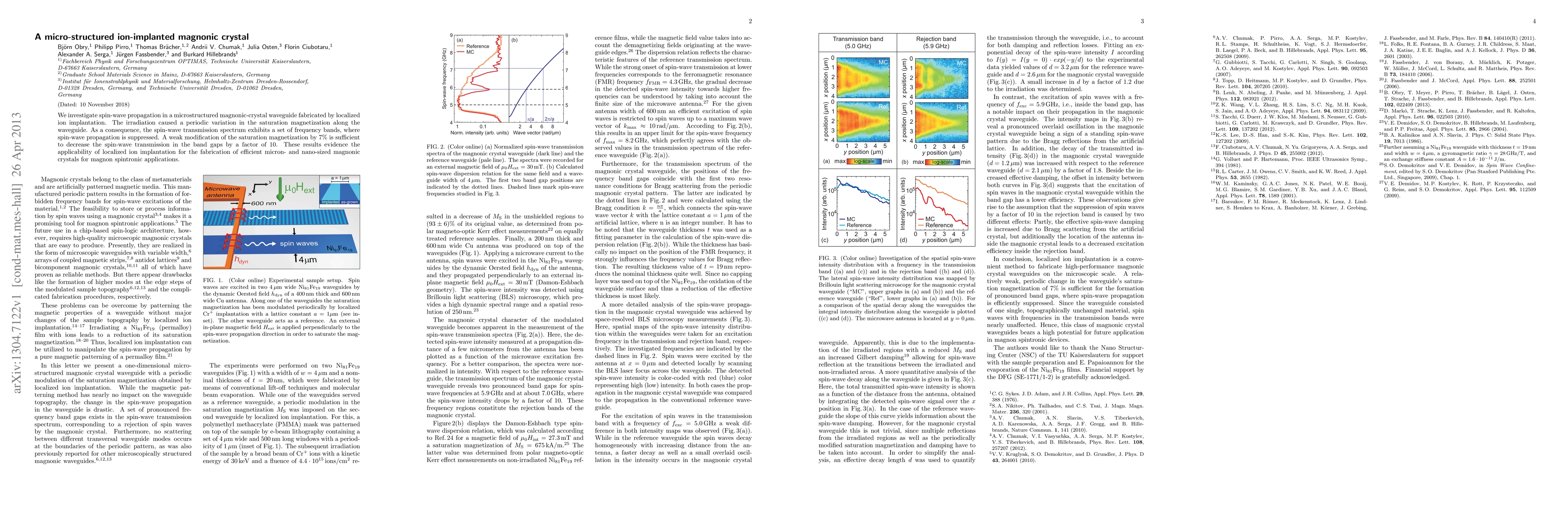 This paper explores spin-wave propagation in a microstructured magnonic crystal waveguide created via localized ion implantation, revealing that periodic changes in saturation magnetization lead to suppressed spin-wave transmission in specific frequency bands. A minor 7% modification in saturation magnetization significantly reduces spin-wave transmission by a factor of 10, demonstrating the potential of ion implantation for developing efficient magnonic crystals for spintronic applications.