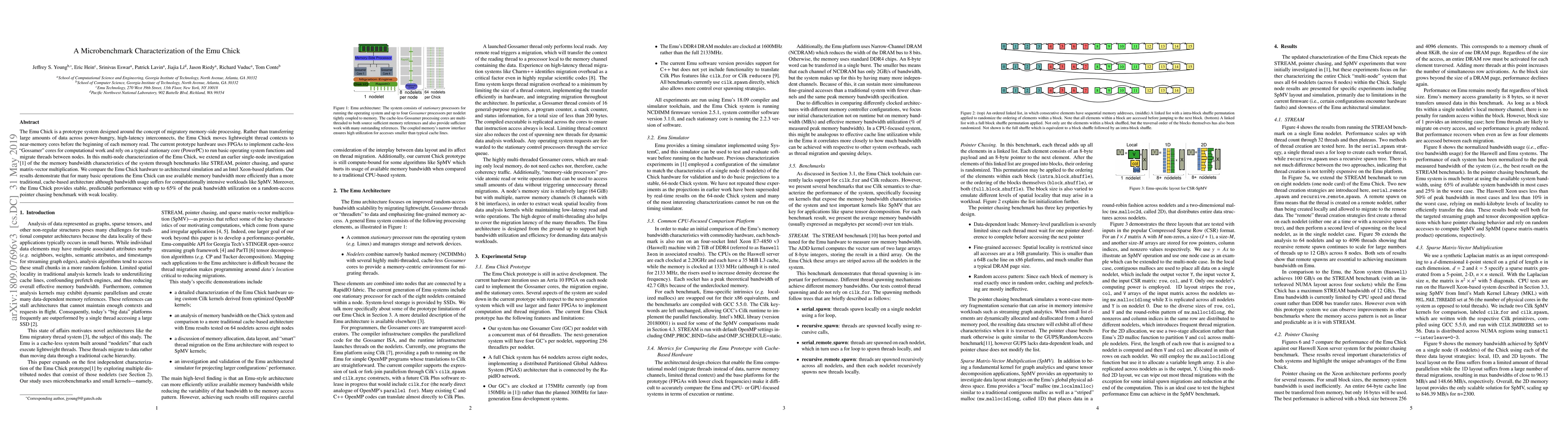 The Emu Chick system outperforms traditional architectures for basic operations but struggles with computationally intensive workloads like matrix-vector multiplication. It achieves stable performance with up to 65% of peak bandwidth utilization on random-access pointer chasing benchmarks.