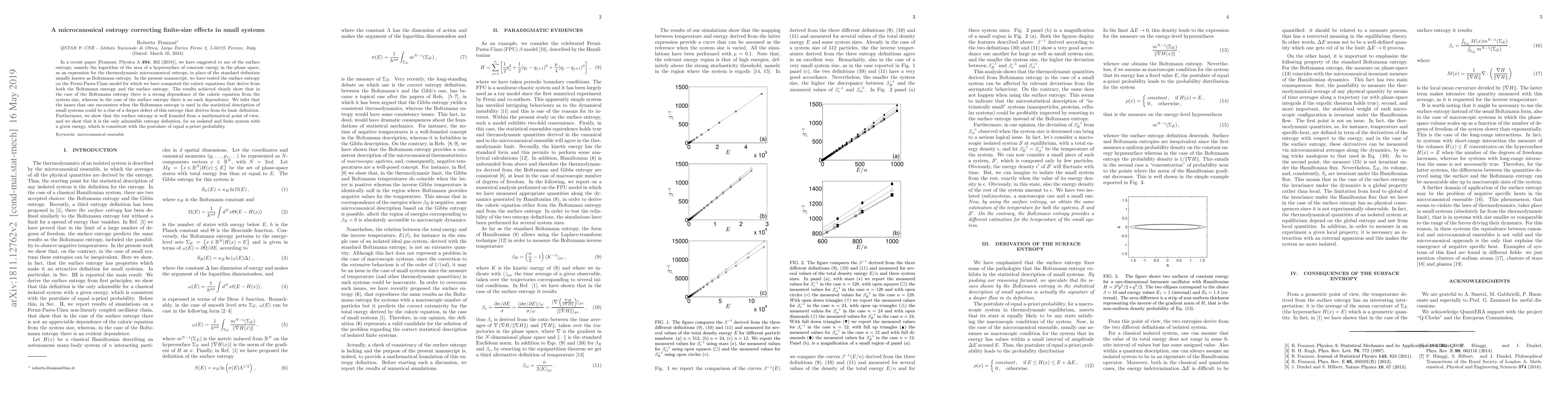 In a recent paper [Franzosi, Physica A {\bf 494}, 302 (2018)], we have suggested to use of the surface entropy, namely the logarithm of the area of a hypersurface of constant energy in the phase space, as an expression for the thermodynamic microcanonical entropy, in place of the standard definition usually known as Boltzmann entropy. In the present manuscript, we have tested the surface entropy on the Fermi-Pasta-Ulam model for which we have computed the caloric equations that derive from both the Boltzmann entropy and the surface entropy. The results achieved clearly show that in the case of the Boltzmann entropy there is a strong dependence of the caloric equation from the system size, whereas in the case of the surface entropy there is no such dependence. We infer that the issues that one encounters when the Boltzmann entropy is used in the statistical description of small systems could be a clue of a deeper defect of this entropy that derives from its basic definition. Furthermore, we show that the surface entropy is well founded from a mathematical point of view, and we show that it is the only admissible entropy definition, for an isolated and finite system with a given energy, which is consistent with the postulate of equal a-priori probability.