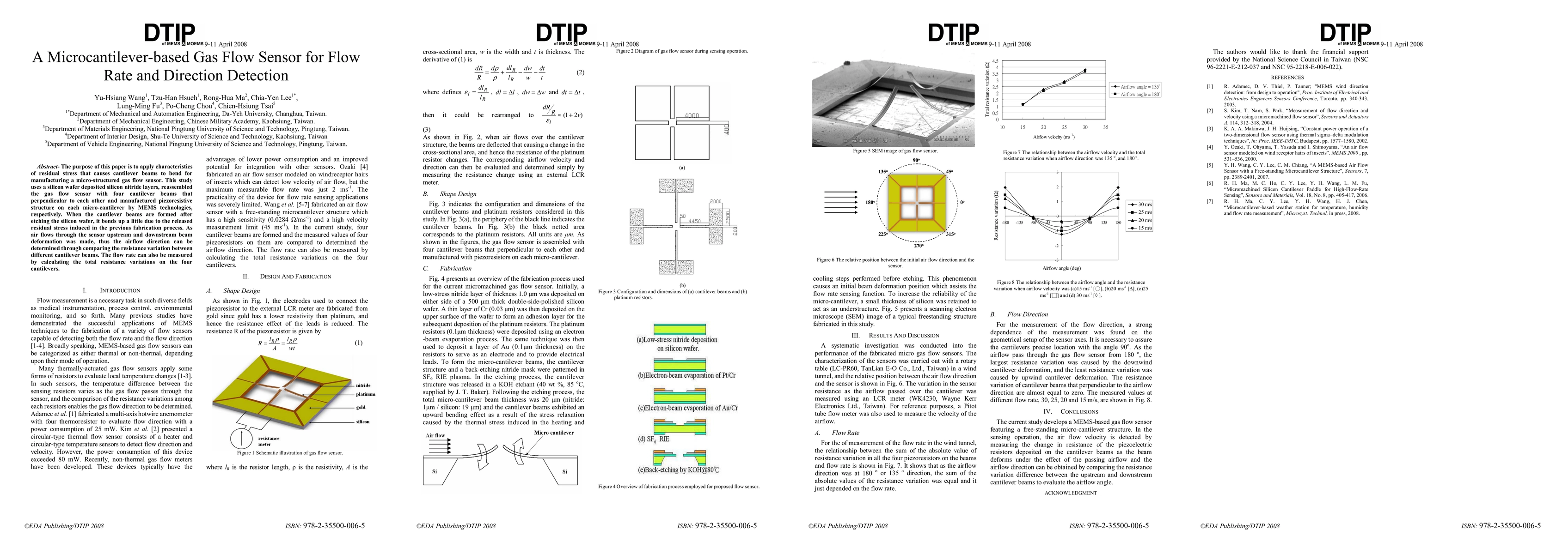 The purpose of this paper is to apply characteristics of residual stress that causes cantilever beams to bend for manufacturing a micro-structured gas flow sensor. This study uses a silicon wafer deposited silicon nitride layers, reassembled the gas flow sensor with four cantilever beams that perpendicular to each other and manufactured piezoresistive structure on each micro-cantilever by MEMS technologies, respectively. When the cantilever beams are formed after etching the silicon wafer, it bends up a little due to the released residual stress induced in the previous fabrication process. As air flows through the sensor upstream and downstream beam deformation was made, thus the airflow direction can be determined through comparing the resistance variation between different cantilever beams. The flow rate can also be measured by calculating the total resistance variations on the four cantilevers.