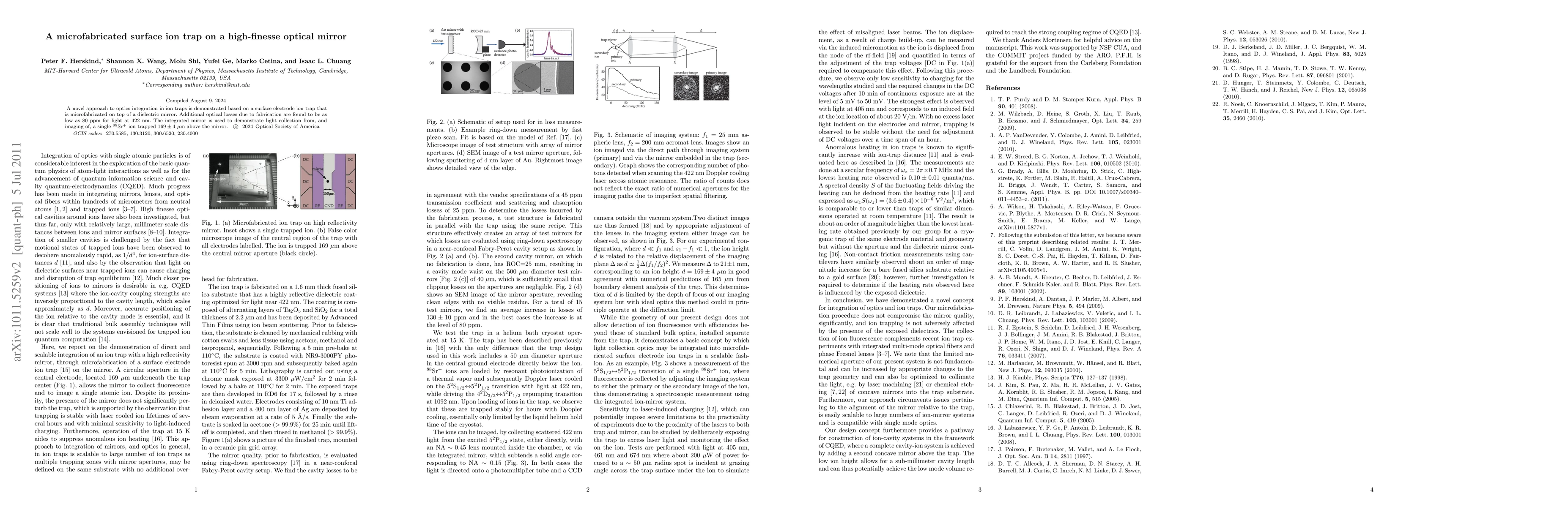 This paper presents a microfabricated surface ion trap on a high-finesse optical mirror, achieving low optical losses of 80 ppm for 422 nm light, and successfully demonstrates light collection and imaging from a single 88 Sr+ ion trapped above the mirror.