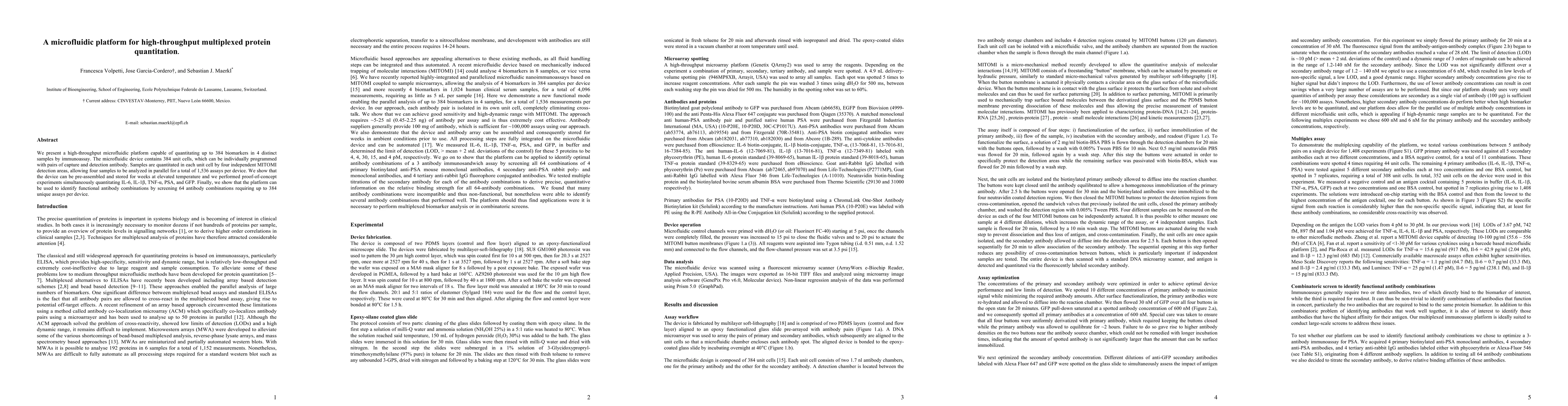 The research introduces a microfluidic platform that can simultaneously quantify up to 384 biomarkers in four samples, using immunoassays. The device, capable of parallel analysis, can store pre-assembled for weeks at elevated temperatures, demonstrating its practicality. It was validated by measuring IL-6, IL-1beta, TNF-alpha, PSA, and GFP, and further proved its utility in screening 64 antibody combinations for functional assays.