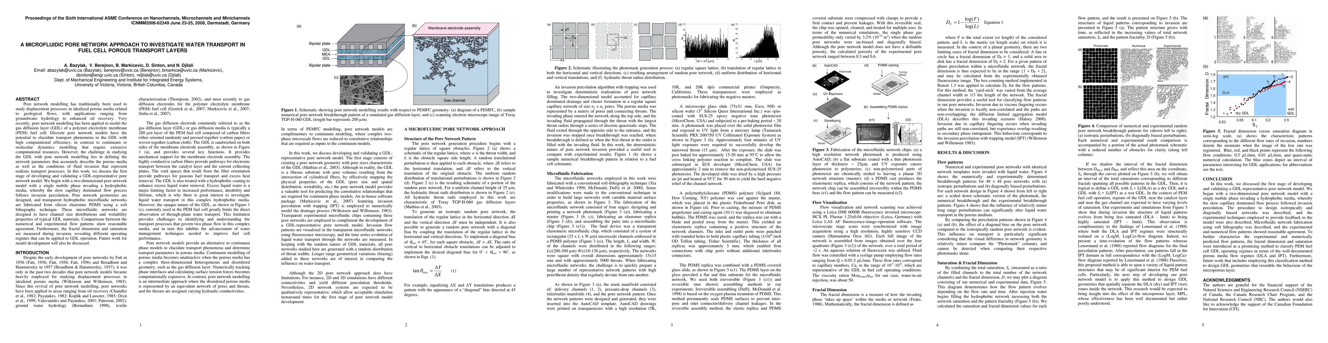 This paper develops a microfluidic pore network model to investigate water transport in fuel cell gas diffusion layers (GDL). The study fabricates transparent hydrophobic microfluidic networks mimicking GDL properties and validates the model by comparing numerical and experimental flow patterns, revealing different operating regimes for GDL operation.