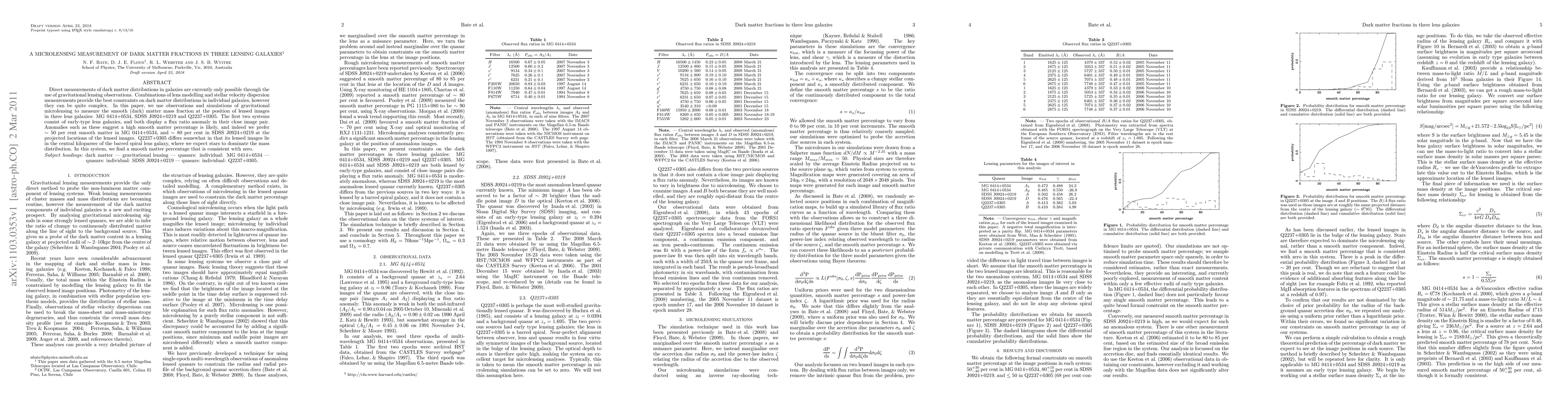 This paper uses gravitational microlensing observations to measure the smooth dark matter mass fraction in three lensing galaxies, finding ~50% in MG 0414+0534, ~80% in SDSS J0924+0219, and a negligible smooth matter percentage in Q2237+0305.