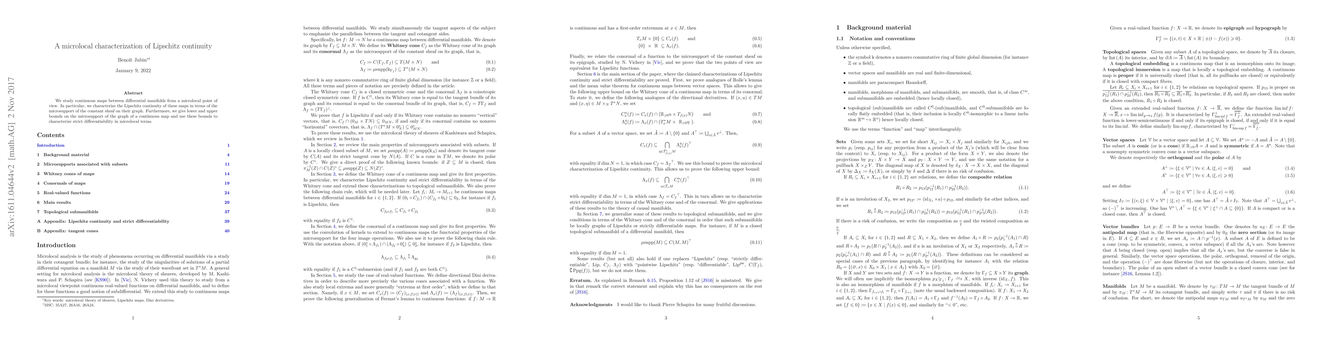 This paper presents a microlocal approach to characterize Lipschitz continuity of maps between differential manifolds, using the microsupport of the constant sheaf on their graph. It also provides bounds on the microsupport of a continuous map's graph to define strict differentiability microlocally.