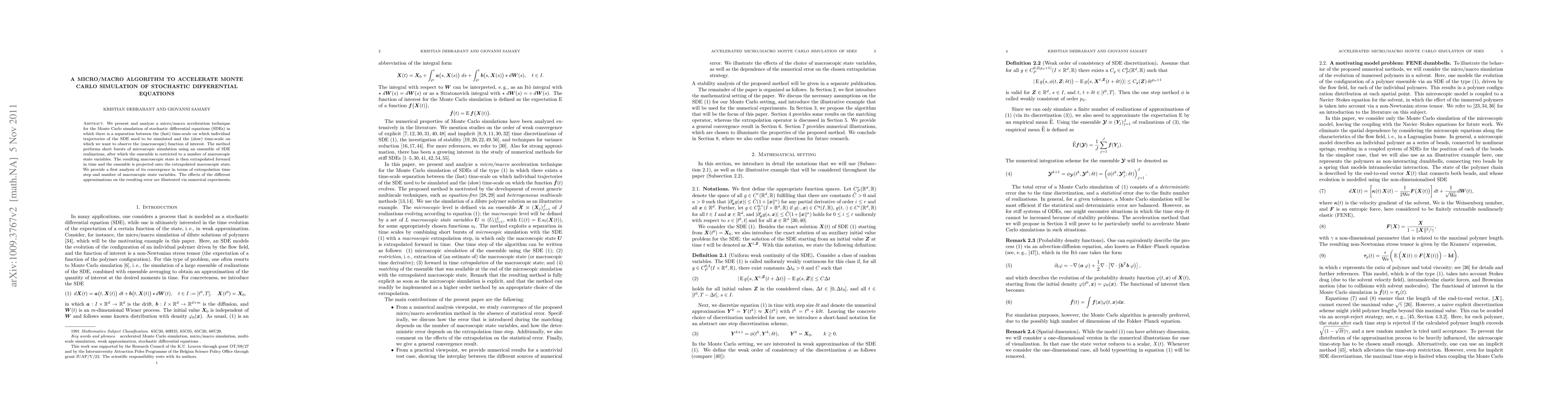 This paper introduces a micro/macro algorithm to speed up Monte Carlo simulations of stochastic differential equations (SDEs) by separating fast microscopic and slow macroscopic time scales. The method uses short bursts of microscopic simulation followed by macroscopic state variable extrapolation and projection, and provides an initial analysis of its convergence and error effects.
