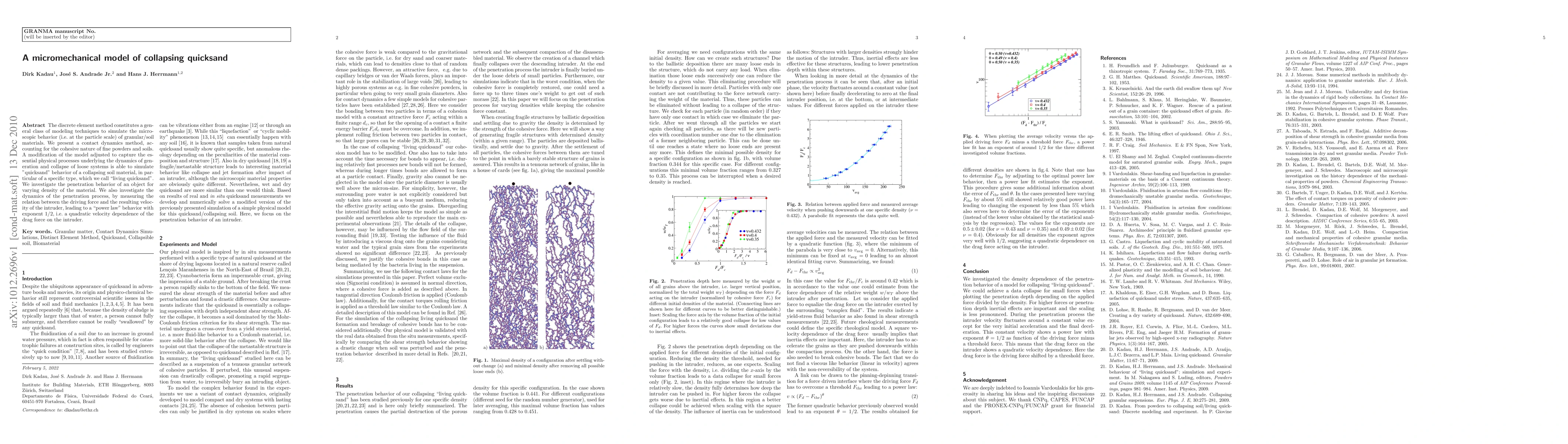 The discrete element method constitutes a general class of modeling techniques to simulate the microscopic behavior (i.e. at the particle scale) of granular/soil materials. We present a contact dynamics method, accounting for the cohesive nature of fine powders and soils. A modification of the model adjusted to capture the essential physical processes underlying the dynamics of generation and collapse of loose systems is able to simulate "quicksand" behavior of a collapsing soil material, in particular of a specific type, which we call "living quicksand". We investigate the penetration behavior of an object for varying density of the material. We also investigate the dynamics of the penetration process, by measuring the relation between the driving force and the resulting velocity of the intruder, leading to a "power law" behavior with exponent 1/2, i.e. a quadratic velocity dependence of the drag force on the intruder.