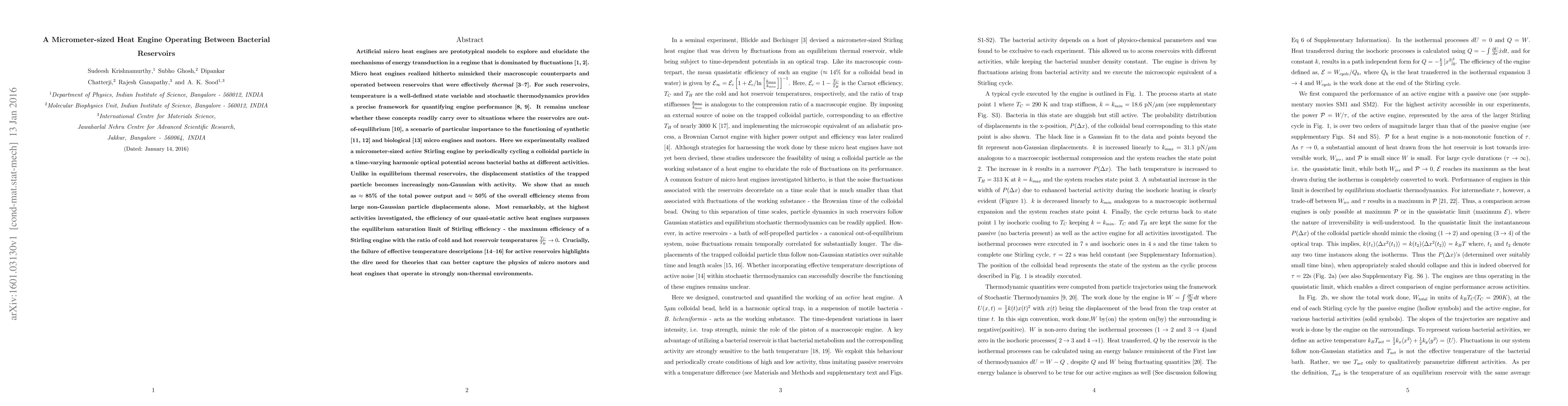 This paper experimentally demonstrates a micrometer-sized active Stirling engine operating between bacterial reservoirs, showing that non-Gaussian particle displacements contribute significantly to its performance. The engine's efficiency exceeds the equilibrium saturation limit, indicating the need for new theories to describe micro engines in non-thermal environments.