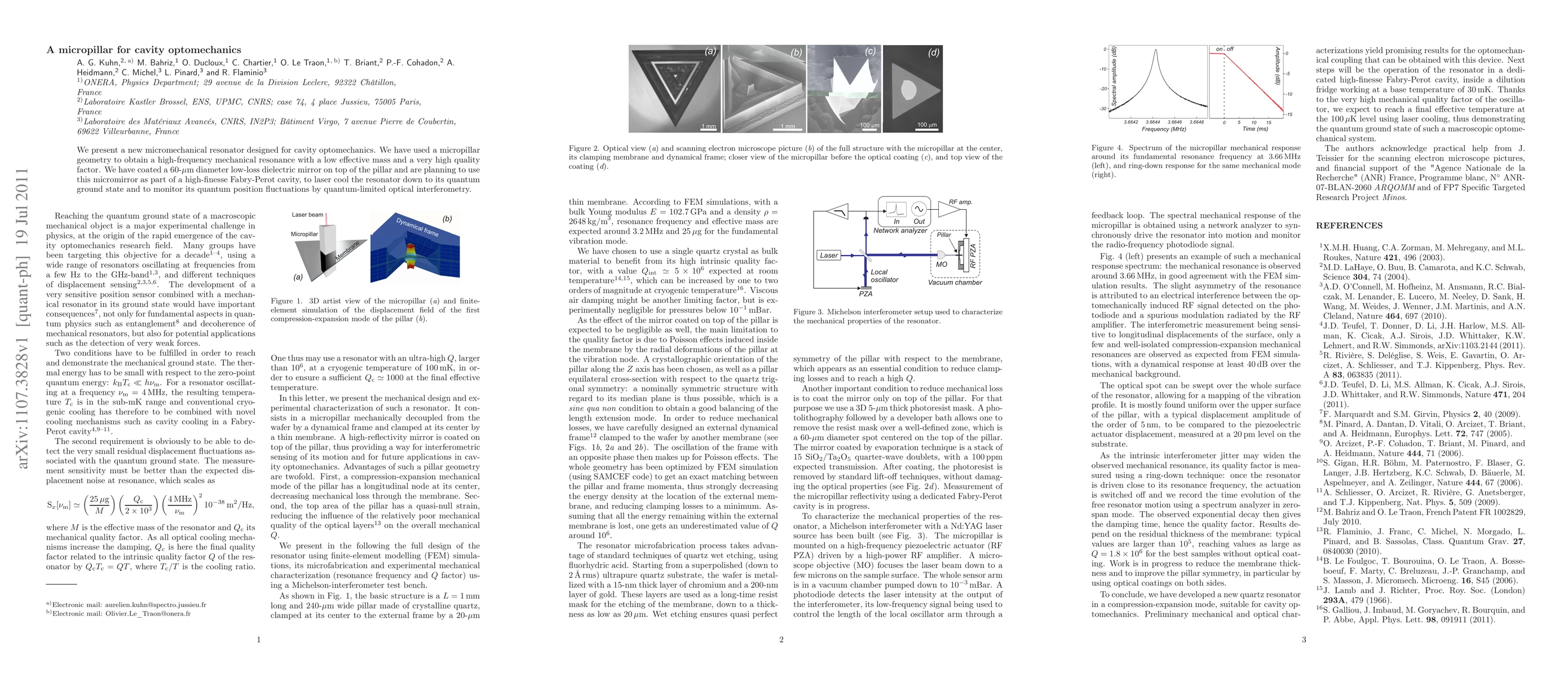 This paper introduces a micropillar-based micromechanical resonator designed for cavity optomechanics, achieving high-frequency mechanical resonance with low effective mass and a high quality factor. The researchers plan to use this micromirror in a high-finesse Fabry-Perot cavity to cool the resonator to its quantum ground state and monitor its quantum position fluctuations via quantum-limited optical interferometry.
