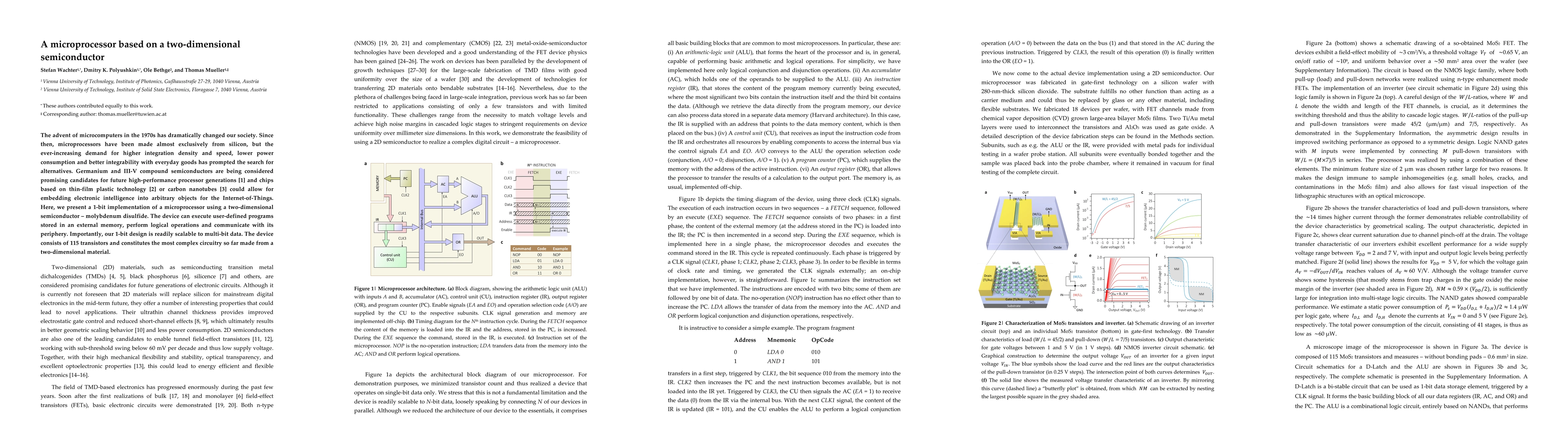 This paper presents a 1-bit microprocessor implemented using molybdenum disulfide, a two-dimensional semiconductor, showcasing its potential for high-performance computing. The device, consisting of 115 transistors, can execute user-defined programs and is scalable to multi-bit data, marking a significant advancement in the use of two-dimensional materials for complex circuitry.