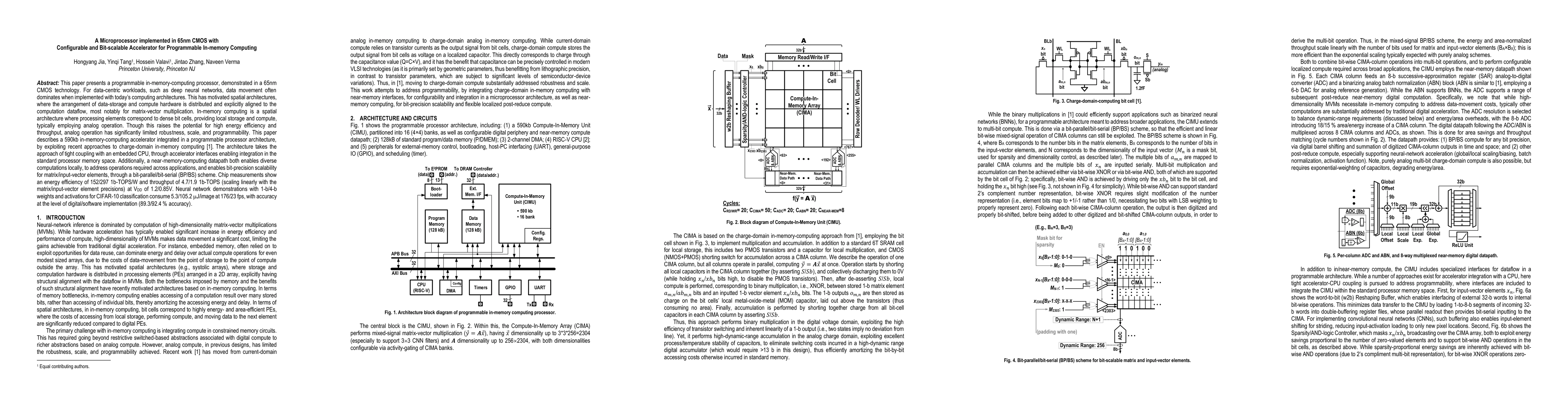 This paper presents a 65nm CMOS microprocessor with an in-memory-computing accelerator for data-centric workloads, achieving high energy efficiency and throughput through bit-scalable, charge-domain operations. The design demonstrates robust neural network performance with low power consumption and comparable accuracy to digital implementations.