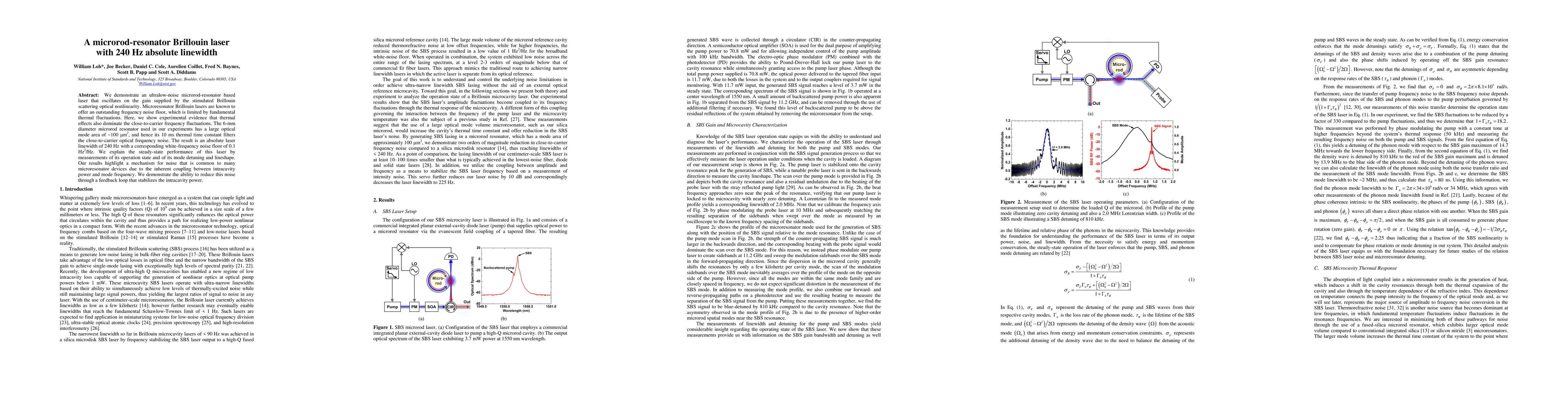 This paper demonstrates an ultralow-noise microrod-resonator Brillouin laser with an absolute linewidth of 240 Hz, attributing the noise reduction to the resonator's large optical mode area and thermal time constant. The study also introduces a feedback loop to further stabilize the intracavity power and reduce noise.