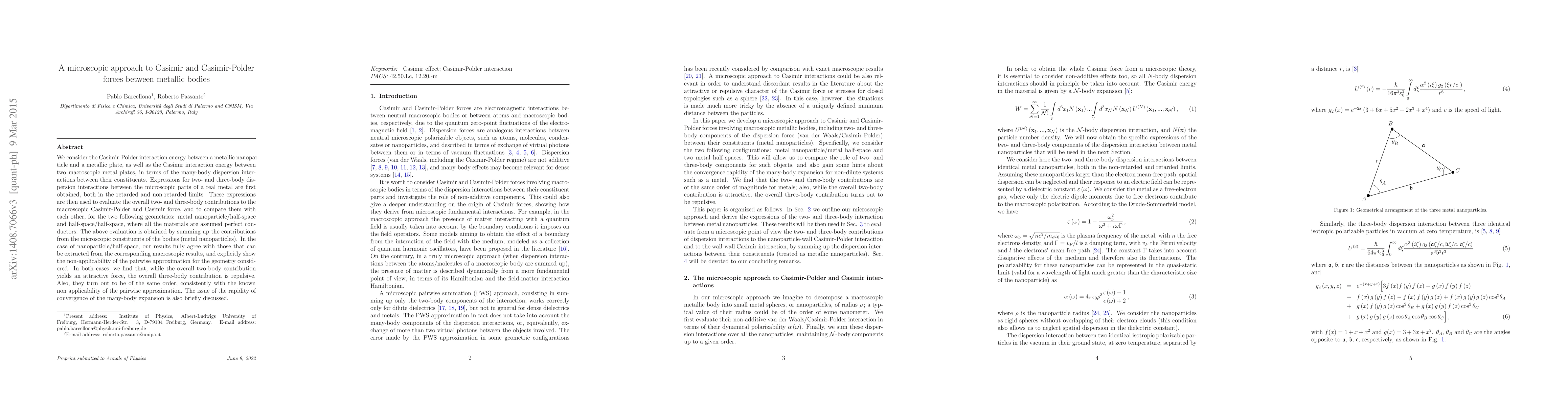 This paper investigates microscopic contributions to Casimir-Polder and Casimir forces between metallic bodies, deriving expressions for two- and three-body dispersion interactions. It finds that while two-body interactions yield an attractive force, three-body interactions are repulsive and of the same order, invalidating the pairwise approximation.