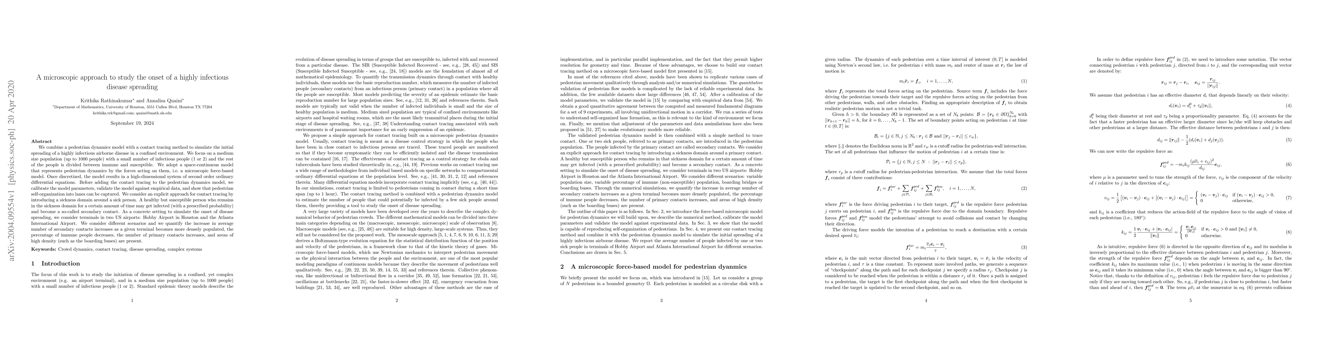 We combine a pedestrian dynamics model with a contact tracing method to simulate the initial spreading of a highly infectious airborne disease in a confined environment. We focus on a medium size population (up to 1000 people) with a small number of infectious people (1 or 2) and the rest of the people is divided between immune and susceptible. We adopt a space-continuous model that represents pedestrian dynamics by the forces acting on them, i.e. a microscopic force-based model. Once discretized, the model results in a high-dimensional system of second order ordinary differential equations. Before adding the contact tracing to the pedestrian dynamics model, we calibrate the model parameters, validate the model against empirical data, and show that pedestrian self-organization into lanes can be captured. We consider an explicit approach for contact tracing by introducing a sickness domain around a sick person. A healthy but susceptible person who remains in the sickness domain for a certain amount of time may get infected (with a prescribed probability) and become a so-called secondary contact. As a concrete setting to simulate the onset of disease spreading, we consider terminals in two US airports: Hobby Airport in Houston and the Atlanta International Airport. We consider different scenarios and we quantify the increase in average number of secondary contacts increases as a given terminal becomes more densely populated, the percentage of immune people decreases, the number of primary contacts increases, and areas of high density (such as the boarding buses) are present.