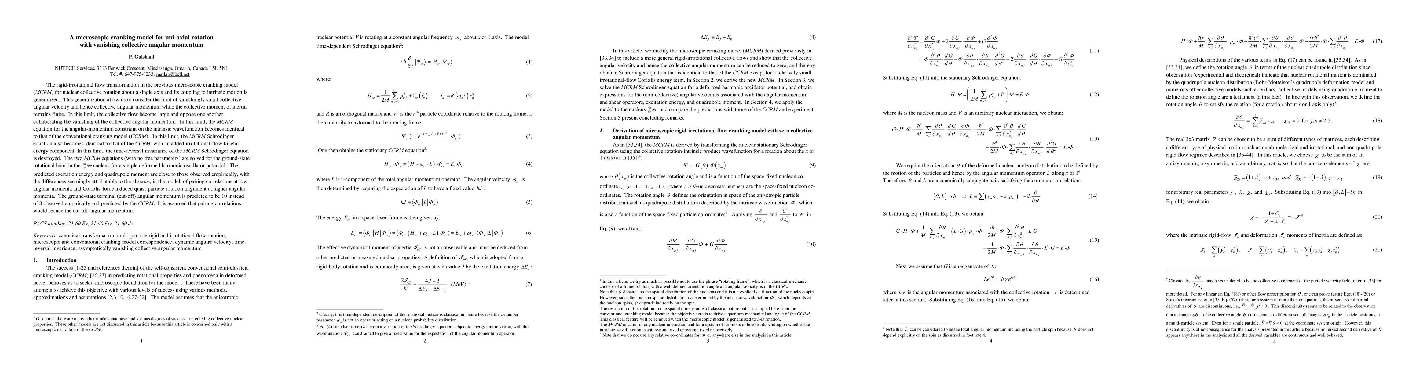 The rigid-irrotational flow transformation in the previous microscopic cranking model (MCRM) for nuclear collective rotation about a single axis and its coupling to intrinsic motion is generalized. This generalization allow us to consider the limit of vanishingly small collective angular velocity and hence collective angular momentum while the collective moment of inertia remains finite. In this limit, the collective flow become large and oppose one another collaborating the vanishing of the collective angular momentum. In this limit, the MCRM equation for the angular-momentum constraint on the intrinsic wavefunction becomes identical to that of the conventional cranking model (CCRM). In this limit, the MCRM Schrodinger equation also becomes identical to that of the CCRM with an added irrotational-flow kinetic energy component. In this limit, the time-reversal invariance of the MCRM Schrodinger equation is destroyed. The two MCRM equations (with no free parameters) are solved for the ground-state rotational band in the nucleus for a simple deformed harmonic oscillator potential. The predicted excitation energy and quadrupole moment are close to those observed empirically, with the differences seemingly attributable to the absence, in the model, of pairing correlations at low angular momenta and Coriolis-force induced quasi-particle rotation alignment at higher angular momenta. The ground-state terminal (cut-off) angular momentum is predicted to be 10 instead of 8 observed empirically and predicted by the CCRM. It is assumed that pairing correlations would reduce the cut-off angular momentum.