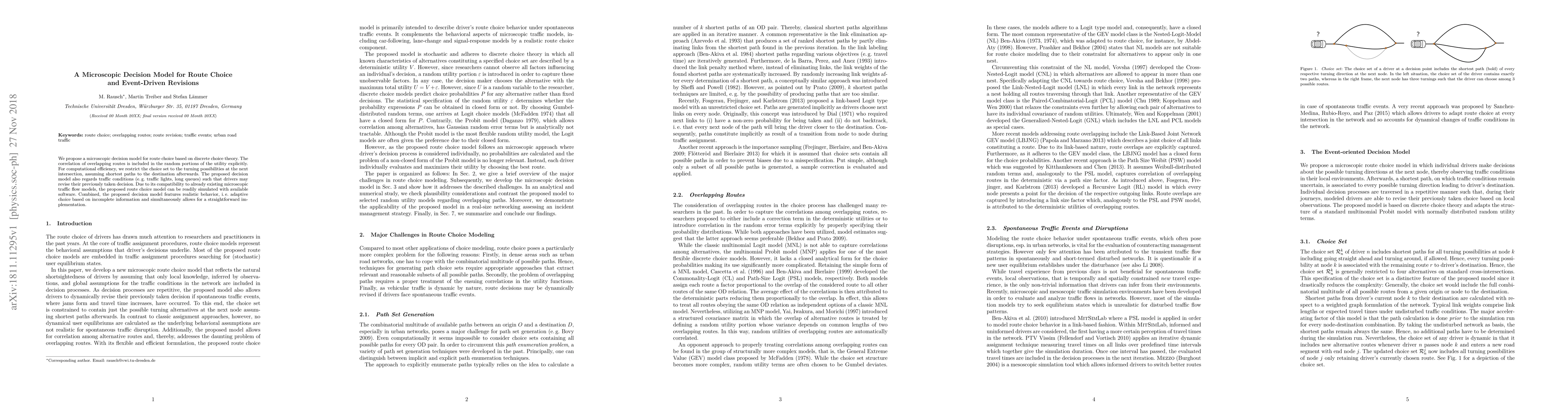 This paper introduces a microscopic decision model for route choice that incorporates overlapping route correlations and allows for dynamic revisions based on real-time traffic conditions. The model focuses on turning possibilities at intersections and is compatible with existing microscopic traffic flow simulations, enabling realistic adaptive behavior and efficient implementation.