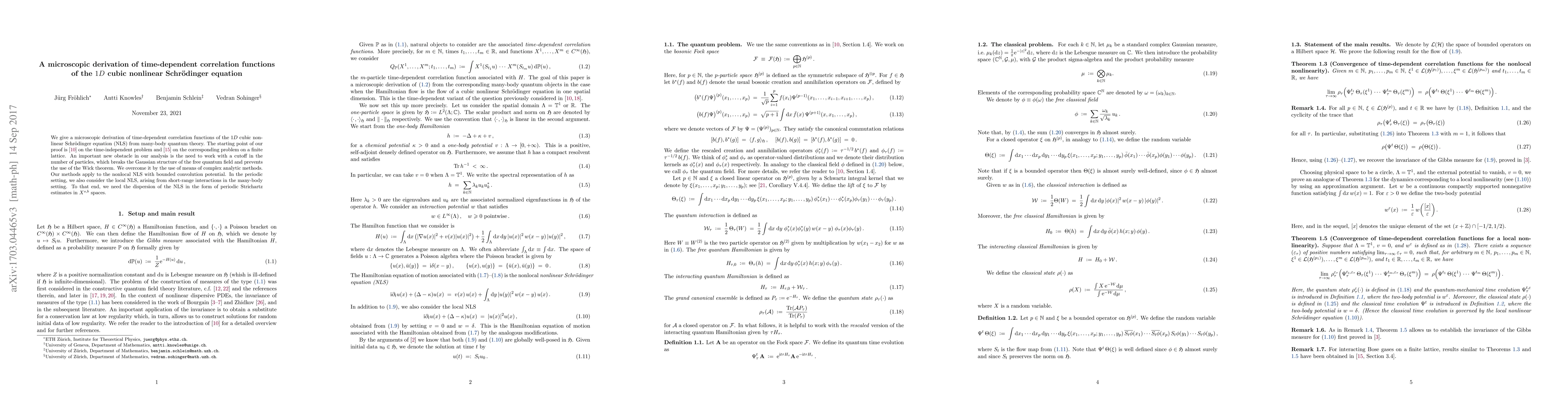 This paper derives time-dependent correlation functions for the 1D cubic nonlinear Schrödinger equation using many-body quantum theory, overcoming the Gaussian structure breakdown with complex analytic methods. It also extends the analysis to nonlocal NLS with convolution potentials and local NLS in periodic settings using periodic Strichartz estimates.