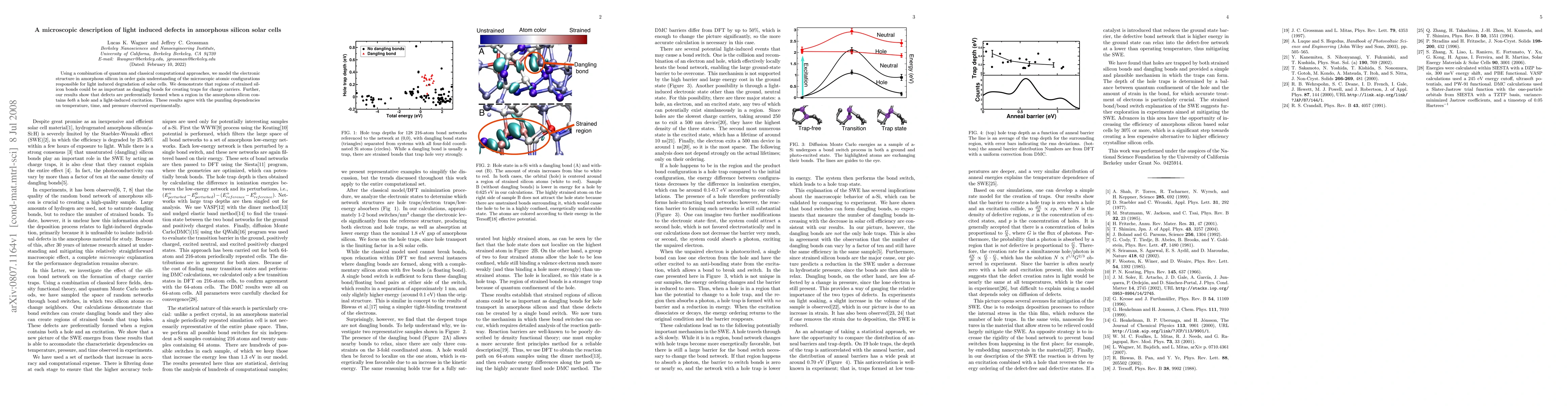 Using a combination of quantum and classical computational approaches, we model the electronic structure in amorphous silicon in order gain understanding of the microscopic atomic configurations responsible for light induced degradation of solar cells. We demonstrate that regions of strained silicon bonds could be as important as dangling bonds for creating traps for charge carriers. Further, our results show that defects are preferentially formed when a region in the amorphous silicon contains a hole and a light-induced excitation. These results agree with the puzzling dependencies on temperature, time, and pressure observed experimentally.