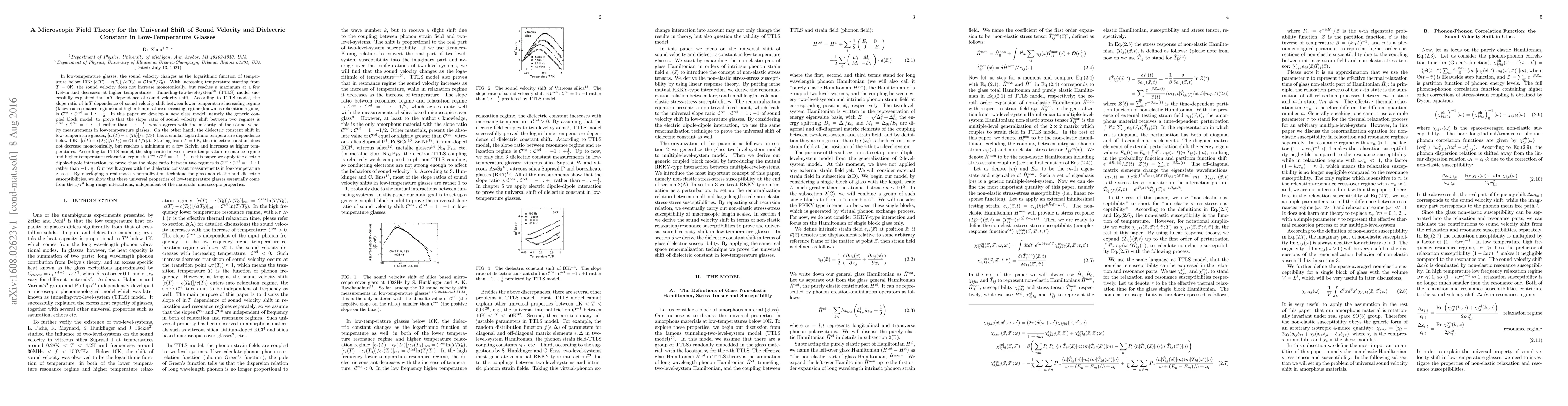 Researchers develop a microscopic field theory to explain how sound velocity and dielectric constant change in low-temperature glasses, finding the slope ratio of changes between two regimes is 1:-1, which agrees with measurements.