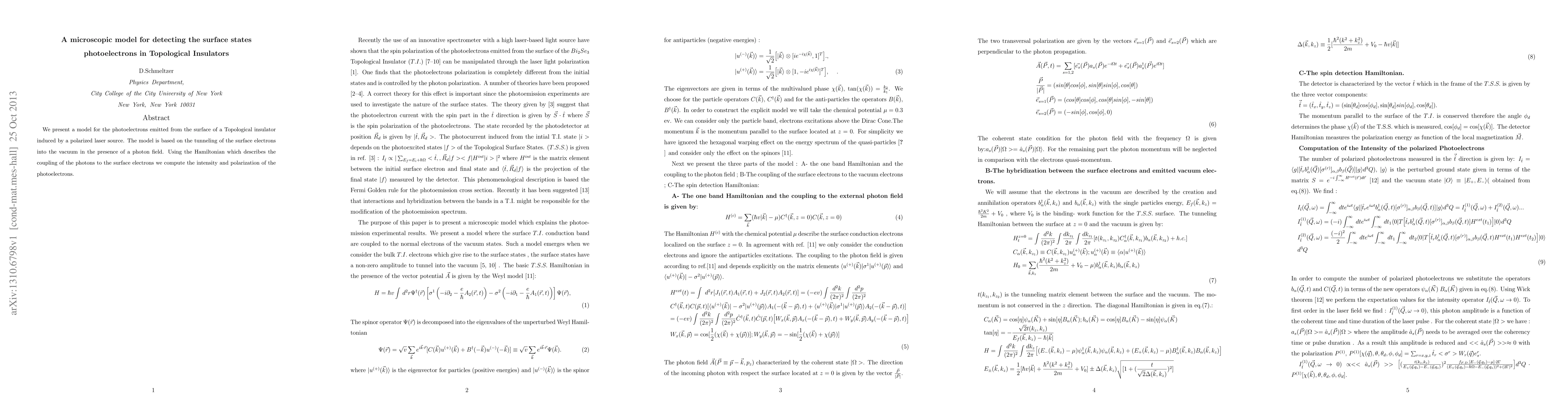 This paper introduces a microscopic model to detect surface states photoelectrons in topological insulators via laser-induced tunneling. The model computes the intensity and polarization of emitted photoelectrons based on the interaction between surface electrons and a photon field.