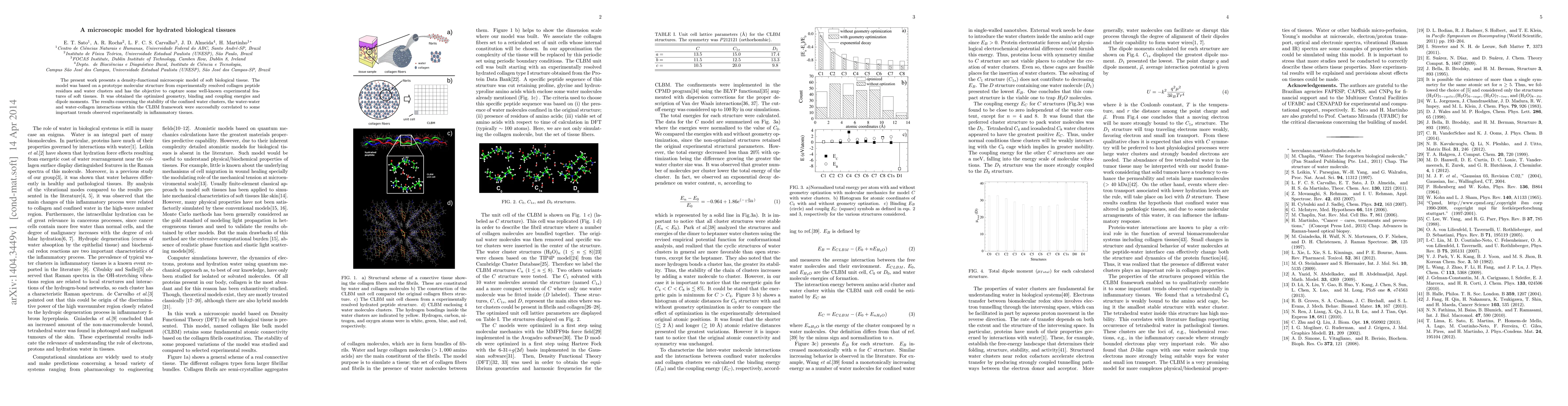 This paper introduces a density-functional microscopic model for hydrated biological tissues, based on collagen peptide residues and water clusters, to capture experimental features of soft tissues. The model successfully correlates optimized geometry and interaction energies with observed trends in inflammatory tissues.