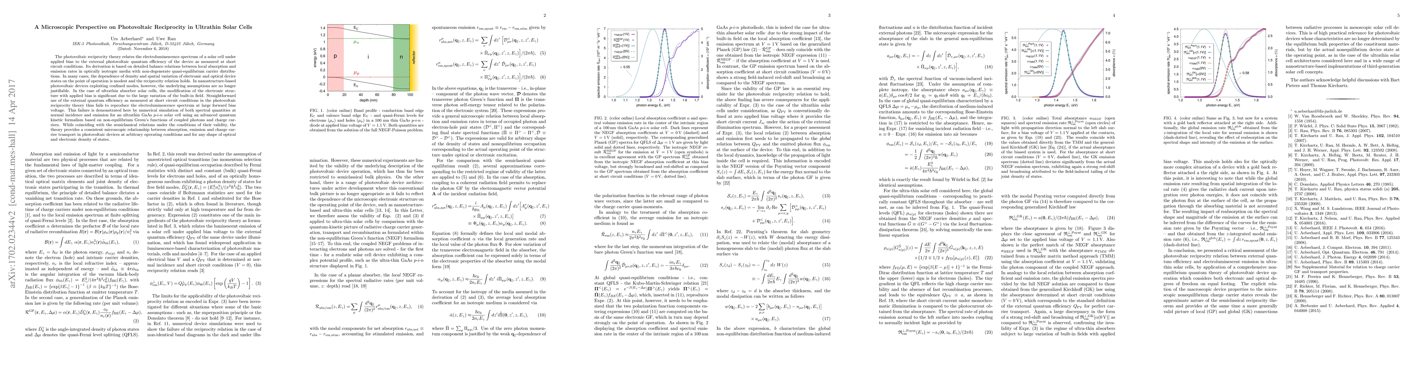 The photovoltaic reciprocity theory relates the electroluminescence spectrum of a solar cell under applied bias to the external photovoltaic quantum efficiency of the device as measured at short circuit conditions. Its derivation is based on detailed balance relations between local absorption and emission rates in optically isotropic media with non-degenerate quasi-equilibrium carrier distributions. In many cases, the dependence of density and spatial variation of electronic and optical device states on the point of operation is modest and the reciprocity relation holds. In nanostructure-based photovoltaic devices exploiting confined modes, however, the underlying assumptions are no longer justifiable. In the case of ultrathin absorber solar cells, the modification of the electronic structure with applied bias is significant due to the large variation of the built-in field. Straightforward use of the external quantum efficiency as measured at short circuit conditions in the photovoltaic reciprocity theory thus fails to reproduce the electroluminescence spectrum at large forward bias voltage. This failure is demonstrated here by numerical simulation of both spectral quantities at normal incidence and emission for an ultrathin GaAs p-i-n solar cell using an advanced quantum kinetic formalism based on non-equilibrium Green's functions of coupled photons and charge carriers. While coinciding with the semiclassical relations under the conditions of their validity, the theory provides a consistent microscopic relationship between absorption, emission and charge carrier transport in photovoltaic devices at arbitrary operating conditions and for any shape of optical and electronic density of states.