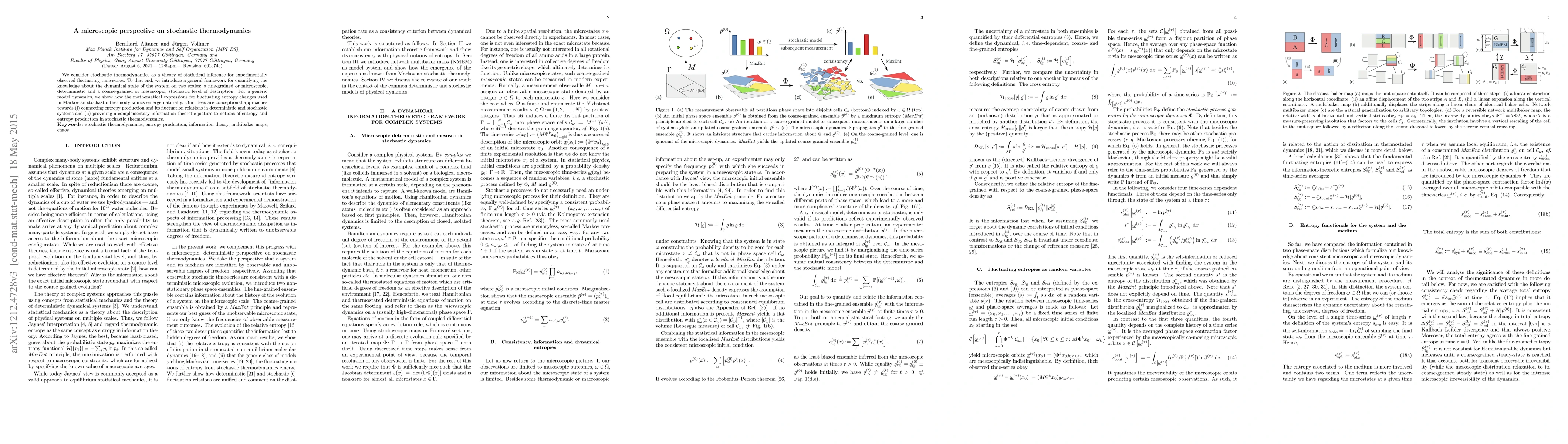 This paper develops a framework for stochastic thermodynamics, linking entropy production and fluctuation relations across microscopic and mesoscopic scales, and provides an information-theoretic perspective on entropy and entropy production in fluctuating systems.