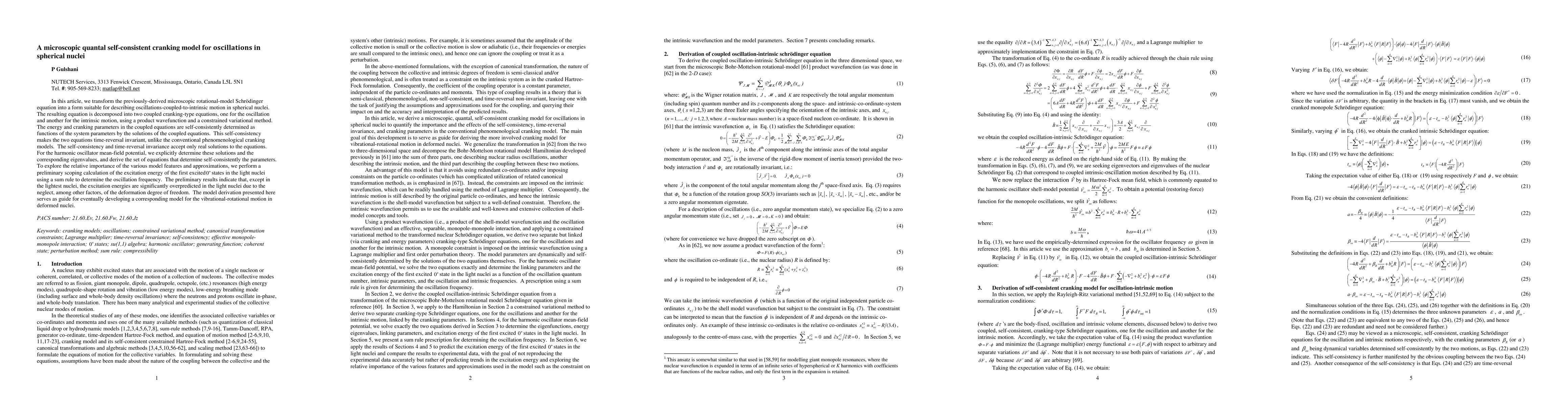 In this article, we transform the previously-derived microscopic rotational-model Schrodinger equation into a form suitable for describing oscillations-coupled-to-intrinsic motion in spherical nuclei. The resulting equation is decomposed into two coupled cranking-type equations, one for the oscillation and another for the intrinsic motion, using a product wavefunction and a constrained variational method. The energy and cranking parameters in the coupled equations are self-consistently determined as functions of the system parameters by the solutions of the equations themselves. This self-consistency makes the two equations time-reversal invariant, unlike the conventional phenomenological cranking models. The self-consistency and time-reversal invariance accept only real solutions to the equations. For the harmonic oscillator mean-field potential, we explicitly determine these solutions and the corresponding eigenvalues, and derive the set of equations that determine self-consistently the parameters. To explore the relative importance of the various model features and approximations, we perform a preliminary scoping calculation of the excitation energy of the first excited states in the light nuclei using a sum rule to determine the oscillation frequency. The preliminary results indicate that, except in the lightest nuclei, the excitation energies are significantly overpredicted in the light nuclei due to the neglect, among other factors, of the deformation degree of freedom. The model derivation presented here serves as guide for eventually developing a corresponding model for the vibrational-rotational motion in deformed nuclei.