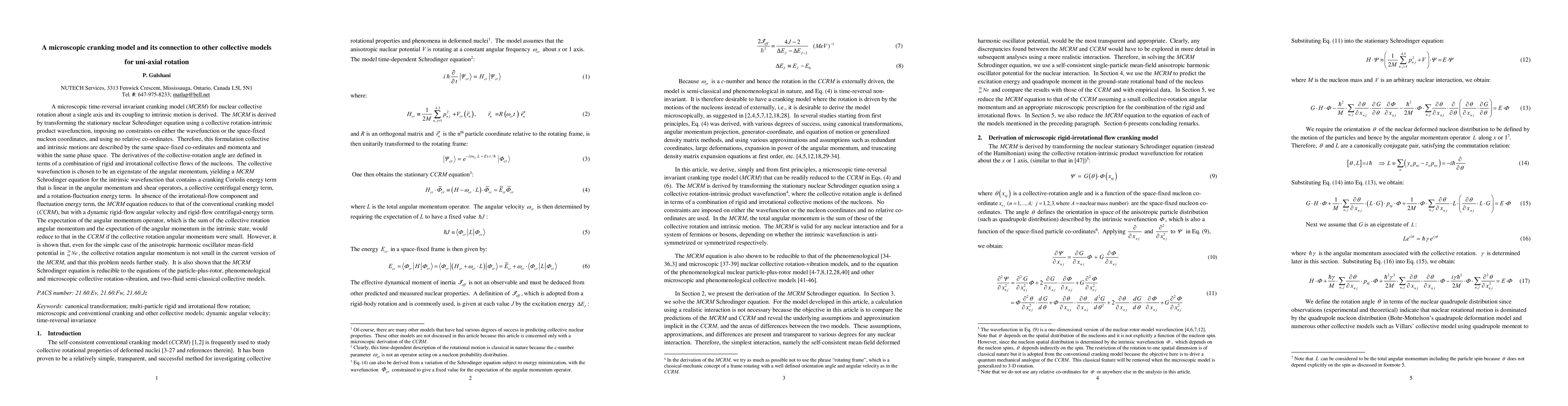 A microscopic time-reversal invariant cranking model (MCRM) for nuclear collective rotation about a single axis and its coupling to intrinsic motion is derived. The MCRM is derived by transforming the stationary nuclear Schrodinger equation using a collective rotation-intrinsic product wavefunction, imposing no constraints on the wavefunction and the nucleon coordinates, and using no relative co-ordinates. The derivatives of the collective-rotation angle are defined in terms of a combination of rigid and irrotational collective flows of the nucleons. The collective wavefunction is chosen to be an eigenstate of the angular momentum, yielding a MCRM Schrodinger equation for the intrinsic wavefunction that contains a cranking Coriolis energy term that is linear in the angular momentum and shear operators, a collective centrifugal energy term, and a rotation-fluctuation energy term. In absence of the irrotational-flow component and fluctuation energy term, the MCRM equation reduces to that of the conventional cranking model (CCRM), but with a dynamic rigid-flow angular velocity and rigid-flow centrifugal-energy term. The expectation of the angular momentum operator, which is the sum of the collective rotation angular momentum and the expectation of the angular momentum in the intrinsic state, would reduce to that in the CCRM if the collective rotation angular momentum were small. However, it is shown that, even for the simple case of the anisotropic harmonic oscillator mean-field potential in , the collective rotation angular momentum is not small in the current version of the MCRM, and that this problem needs further study. It is also shown that the MCRM Schrodinger equation is reducible to the equations of the particle-plus-rotor, phenomenological and microscopic collective rotation-vibration, and two-fluid semi-classical collective models.