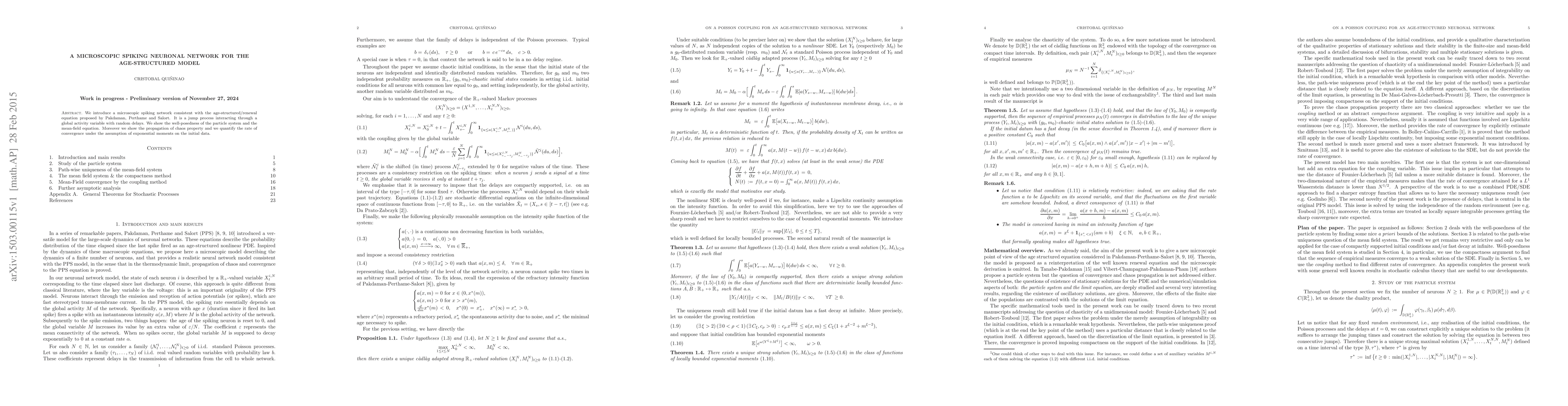 We introduce a microscopic spiking network consistent with the age-structured/renewal equation proposed by Pakdaman, Perthame and Salort. It is a jump process interacting through a global activity variable with random delays. We show the well-posedness of the particle system and the mean-field equation. Moreover we show the propagation of chaos property and we quantify the rate of convergence under the assumption of exponential moments on the initial data.