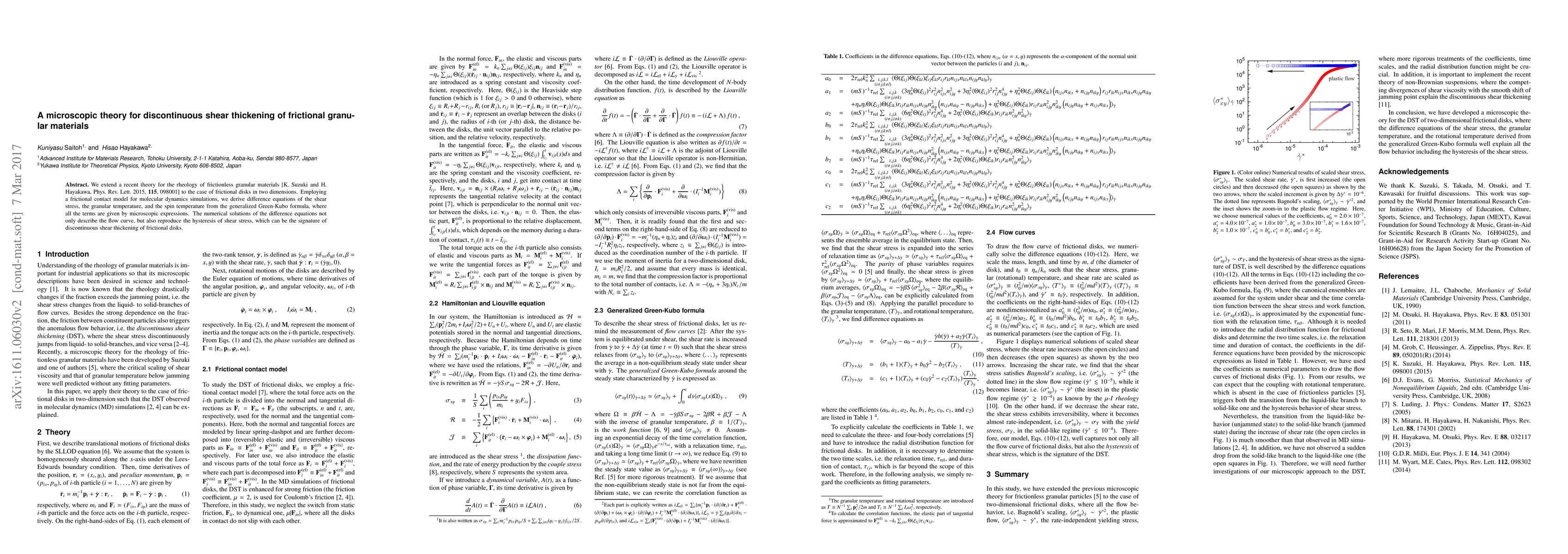This paper extends a theory for frictionless granular materials to include frictional disks, deriving microscopic expressions for shear stress, granular temperature, and spin temperature from molecular dynamics simulations. The numerical solutions accurately describe the flow curve and reproduce the hysteresis indicative of discontinuous shear thickening.