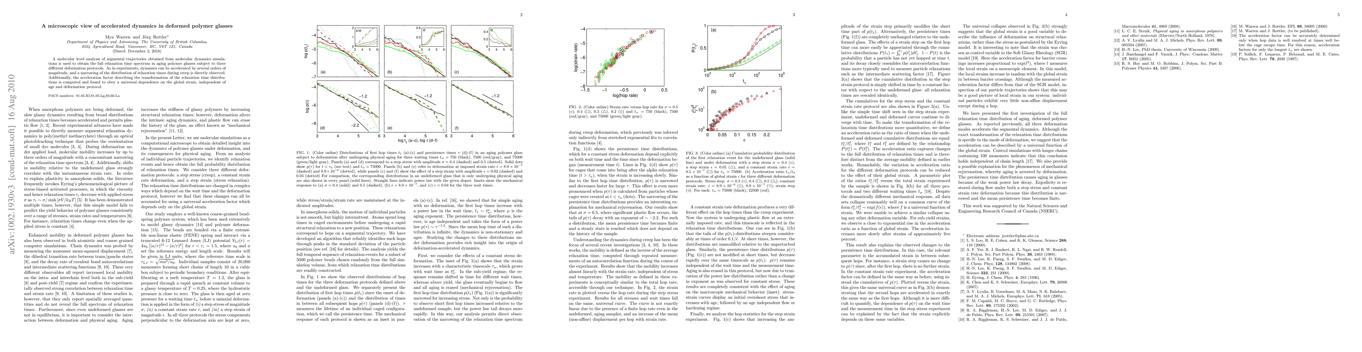A molecular level analysis of segmental trajectories obtained from molecular dynamics simulations is used to obtain the full relaxation time spectrum in aging polymer glasses subject to three different deformation protocols. As in experiments, dynamics can be accelerated by several orders of magnitude, and a narrowing of the distribution of relaxation times during creep is directly observed. Additionally, the acceleration factor describing the transformation of the relaxation time distributions is computed and found to obey a universal dependence on the global strain, independent of age and deformation protocol.