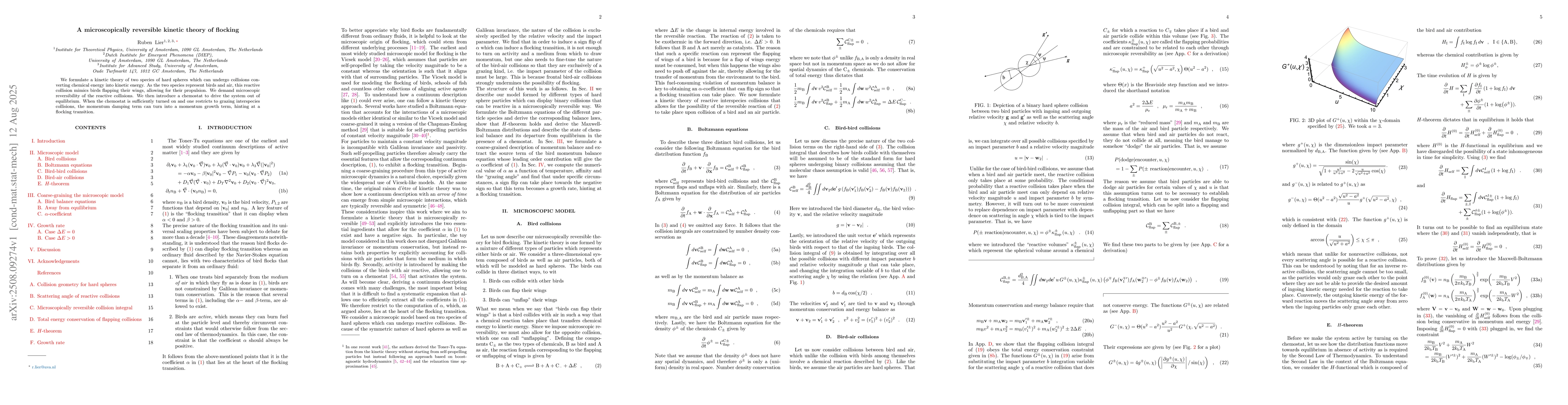 We formulate a kinetic theory of two species of hard spheres which can undergo collisions converting chemical energy into kinetic energy. As the two species represent birds and air, this reactive collision mimics birds flapping their wings, allowing for their propulsion. We demand microscopic reversibility of the reactive collisions. We then introduce a chemostat to drive the system out of equilibrium. When the chemostat is sufficiently turned on and one restricts to grazing interspecies collisions, the momentum damping term can turn into a momentum growth term, hinting at a flocking transition.