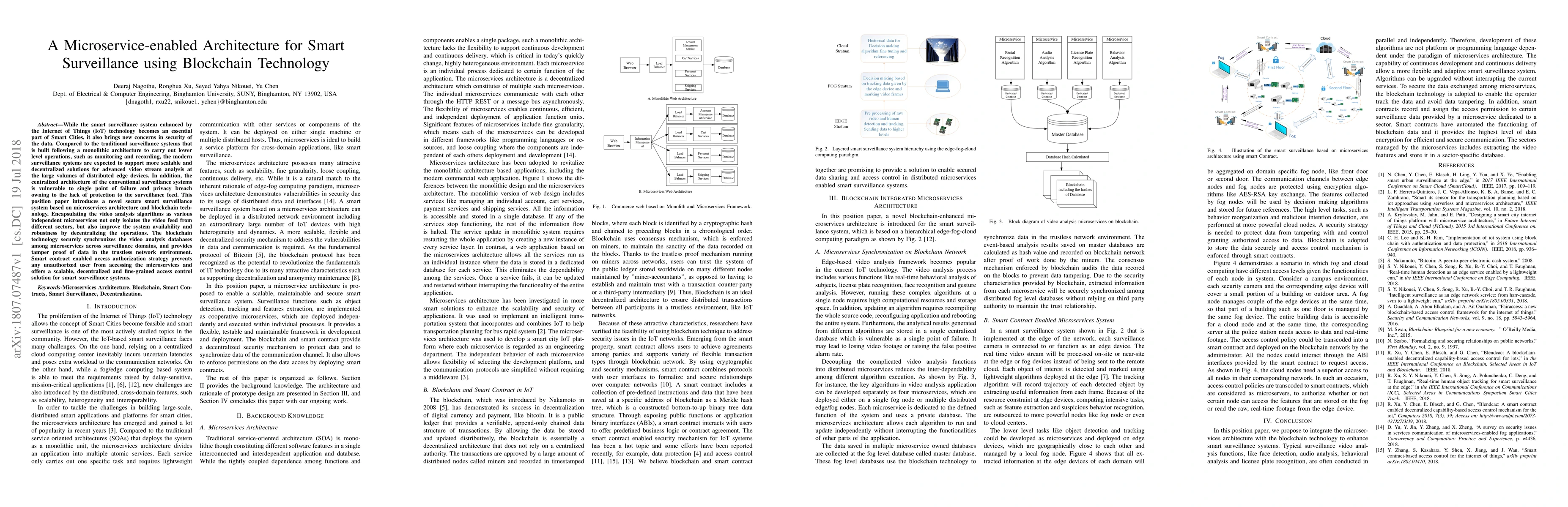 This paper proposes a secure smart surveillance system using microservices and blockchain technology to address security concerns in IoT-enhanced surveillance. It decentralizes video analysis operations and employs blockchain for secure, tamper-proof data synchronization and fine-grained access control via smart contracts.