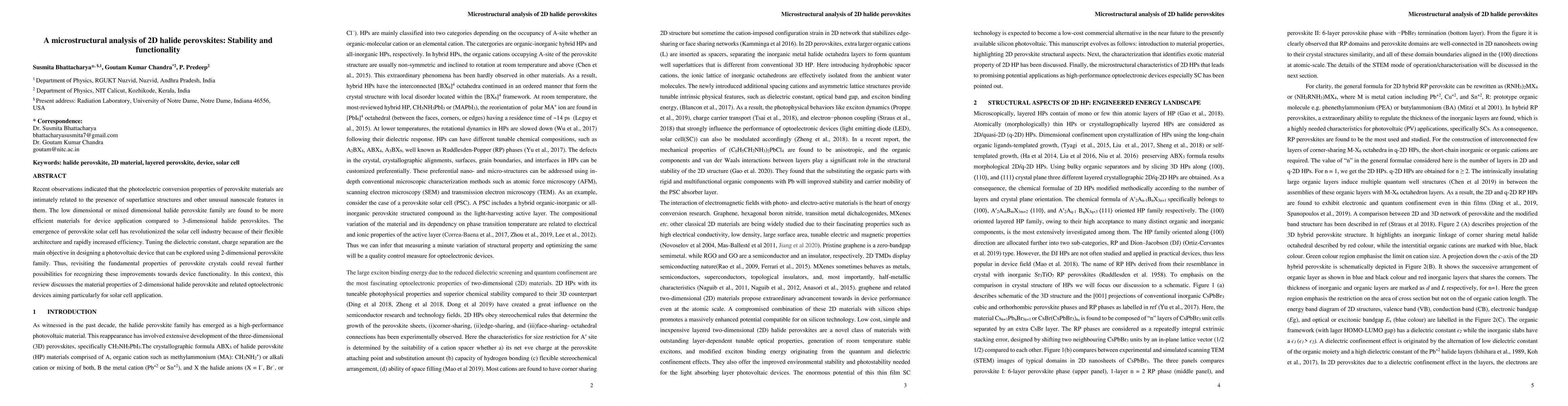 This paper reviews the microstructural properties of 2D halide perovskites, emphasizing their enhanced efficiency and stability compared to 3D counterparts, and explores their potential in advancing photovoltaic devices, particularly solar cells. The focus is on tuning dielectric constants and charge separation for improved device functionality.