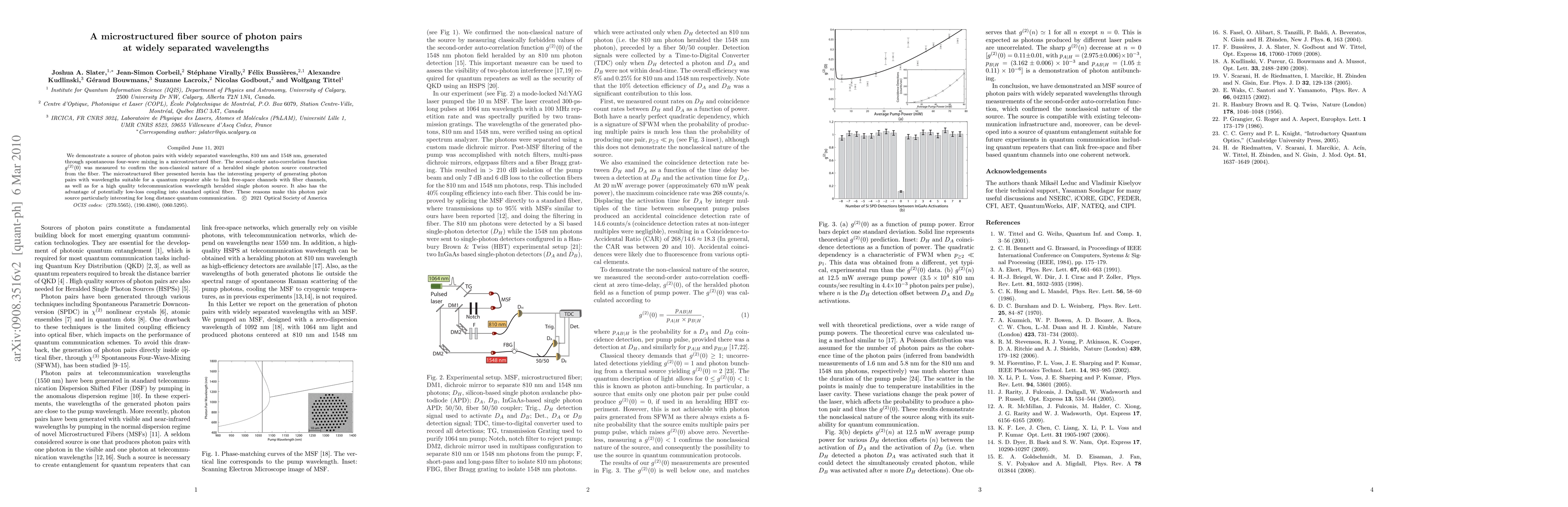 We demonstrate a source of photon pairs with widely separated wavelengths, 810 nm and 1548 nm, generated through spontaneous four-wave mixing in a microstructured fiber. The second-order auto-correlation function g^{(2)}(0) was measured to confirm the non-classical nature of a heralded single photon source constructed from the fiber. The microstructured fiber presented herein has the interesting property of generating photon pairs with wavelengths suitable for a quantum repeater able to link free-space channels with fiber channels, as well as for a high quality telecommunication wavelength heralded single photon source. It also has the advantage of straightforward coupling into optical fiber. These reasons make this photon pair source particularly interesting for long distance quantum communication.
