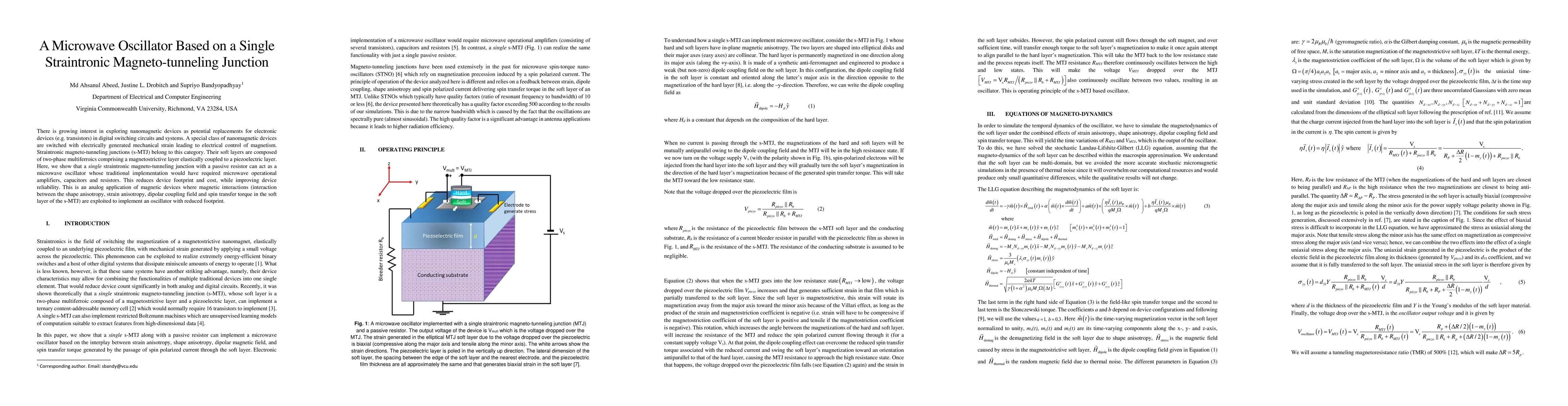 This paper demonstrates a microwave oscillator based on a single straintronic magneto-tunneling junction, eliminating the need for traditional components like operational amplifiers and capacitors, thus reducing device size, cost, and improving reliability. The oscillator leverages magnetic interactions within the junction's soft layer for its operation.