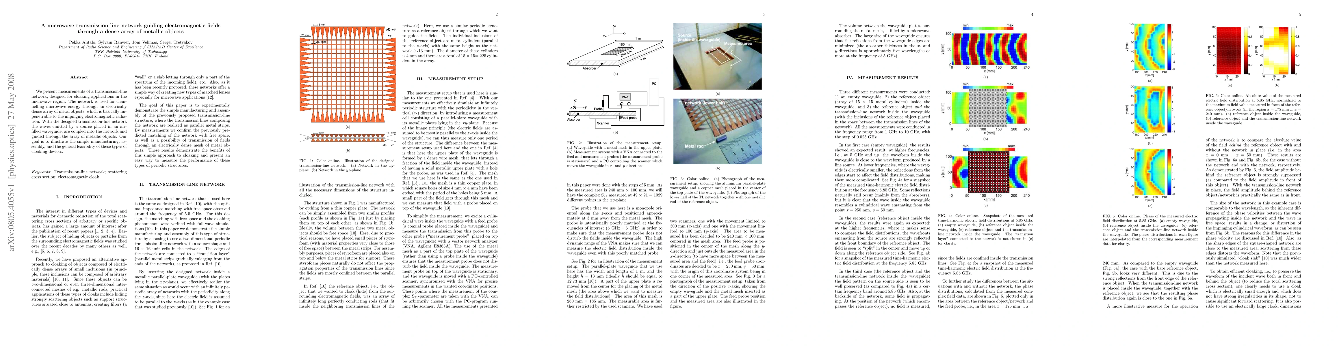 We present measurements of a transmission-line network, designed for cloaking applications in the microwave region. The network is used for channelling microwave energy through an electrically dense array of metal objects, which is basically impenetrable to the impinging electromagnetic radiation. With the designed transmission-line network the waves emitted by a source placed in an air-filled waveguide, are coupled into the network and guided through the array of metallic objects. Our goal is to illustrate the simple manufacturing, assembly, and the general feasibility of these types of cloaking devices.