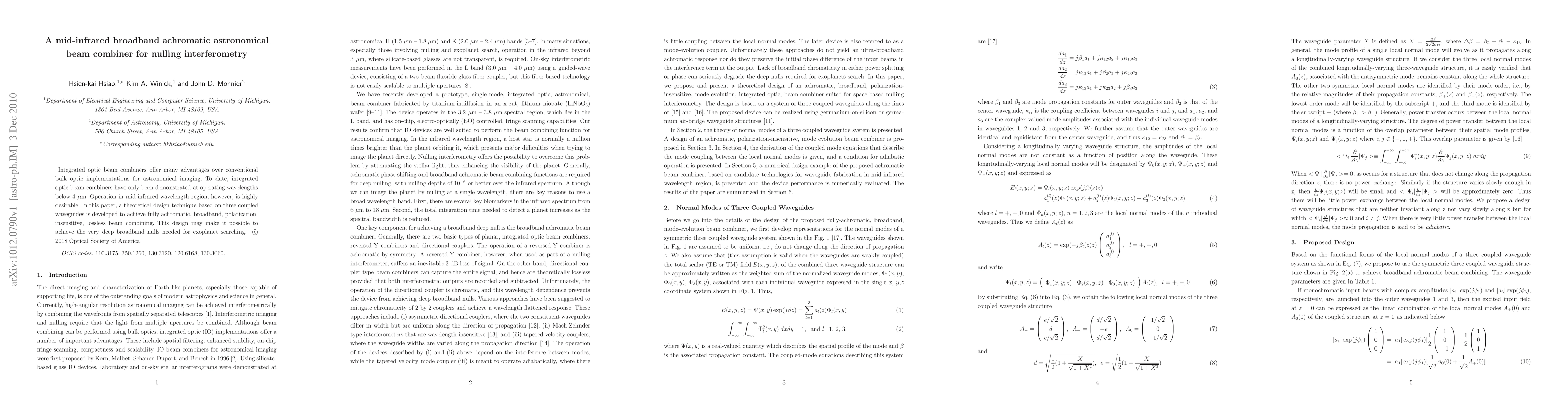 Integrated optic beam combiners offer many advantages over conventional bulk optic implementations for astronomical imaging. To date, integrated optic beam combiners have only been demonstrated at operating wavelengths below 4 microns. Operation in mid-infrared wavelength region, however, is highly desirable. In this paper, a theoretical design technique based on three coupled waveguides is developed to achieve fully achromatic, broadband, polarization-insensitive, lossless beam combining. This design may make it possible to achieve the very deep broadband nulls needed for exoplanet searching.