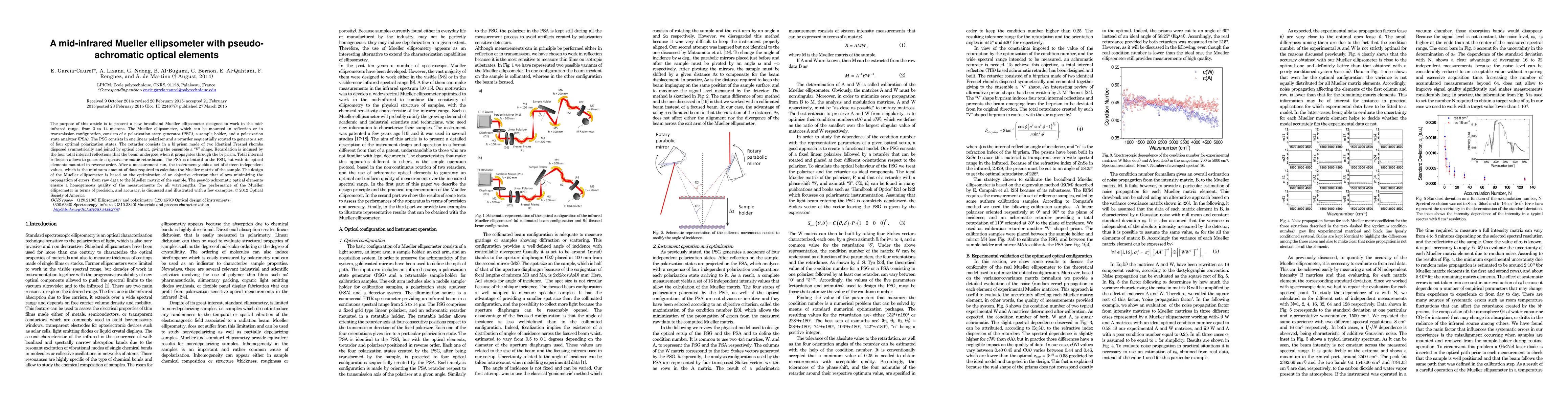 This paper presents a new mid-infrared Mueller ellipsometer operating from 3 to 14 microns, featuring pseudo-achromatic optical elements for consistent measurement quality across wavelengths. The design optimizes error reduction and provides a set of sixteen values to calculate the Mueller matrix, enabling precise and accurate analysis.