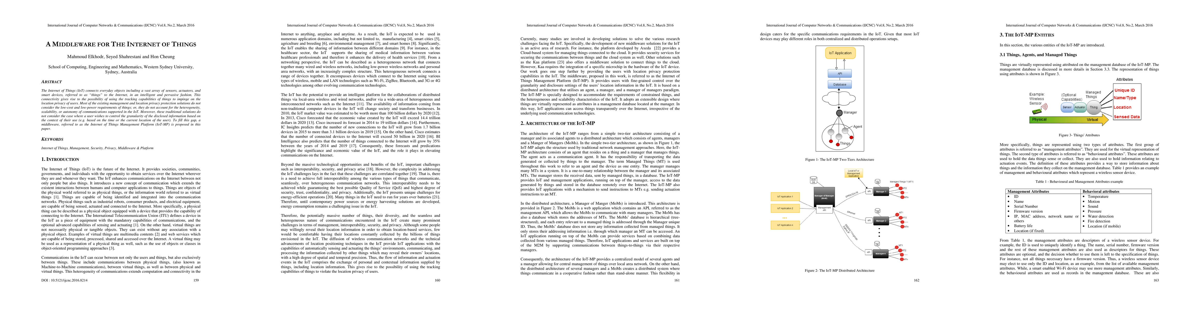 This paper proposes a middleware called Internet of Things Management Platform (IoT-MP) to address location privacy concerns in IoT, considering low-cost, low-power, heterogeneity, scalability, and user-controlled information granularity based on context. Traditional solutions fall short in these areas.