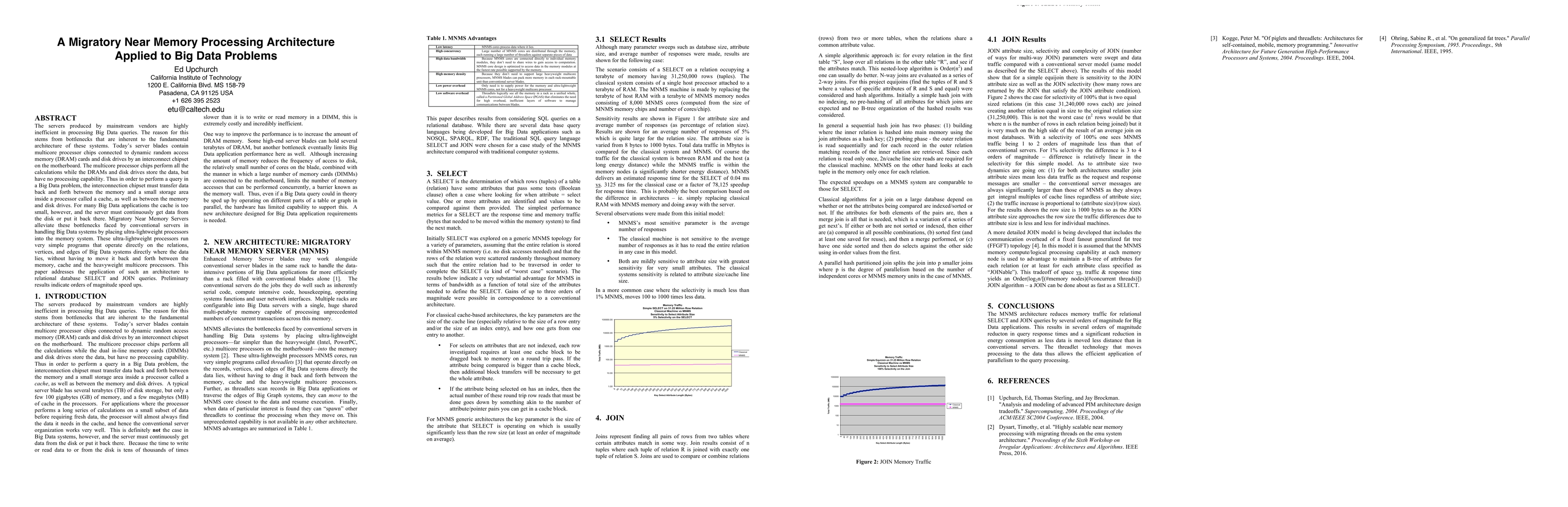 Servers produced by mainstream vendors are inefficient in processing Big Data queries due to bottlenecks inherent in the fundamental architecture of these systems. Current server blades contain multicore processors connected to DRAM memory and disks by an interconnection chipset. The multicore processor chips perform all the computations while the DRAM and disks store the data but have no processing capability. To perform a database query, data must be moved back and forth between DRAM and a small cache as well as between DRAM and disks. For Big Data applications this data movement in onerous. Migratory Near Memory Servers address this bottleneck by placing large numbers of lightweight processors directly into the memory system. These processors operate directly on the relations, vertices and edges of Big Data applications in place without having to shuttle large quantities of data back and forth between DRAM, cache and heavyweight multicore processors. This paper addresses the application of such an architecture to relational database SELECT and JOIN queries. Preliminary results indicate end-to-end orders of magnitude speedup.