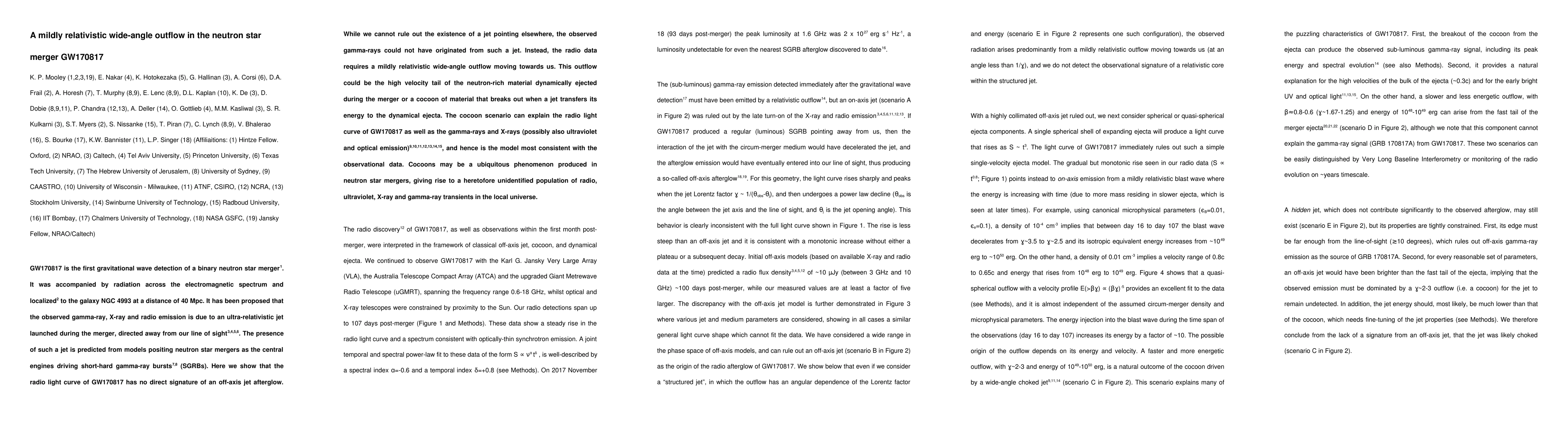 This paper investigates the aftermath of the neutron star merger GW170817, finding no evidence for an ultra-relativistic jet, but instead supporting a mildly relativistic wide-angle outflow. This outflow, possibly a cocoon from the merger, explains the observed gamma-rays, X-rays, and radio emissions.