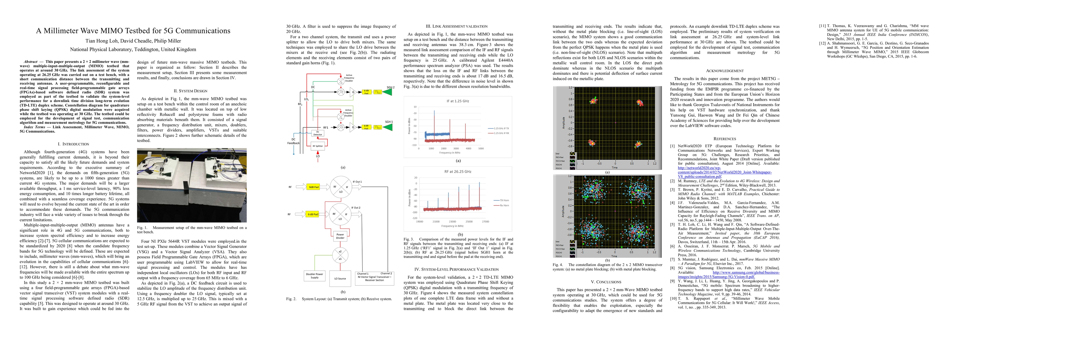 The research presents a 2x2 mm-wave MIMO testbed operating at around 30 GHz, utilizing a user-programmable, reconfigurable, and real-time signal processing FPGAs-based SDR system for system-level performance validation of a downlink TD-LTE duplex scheme.